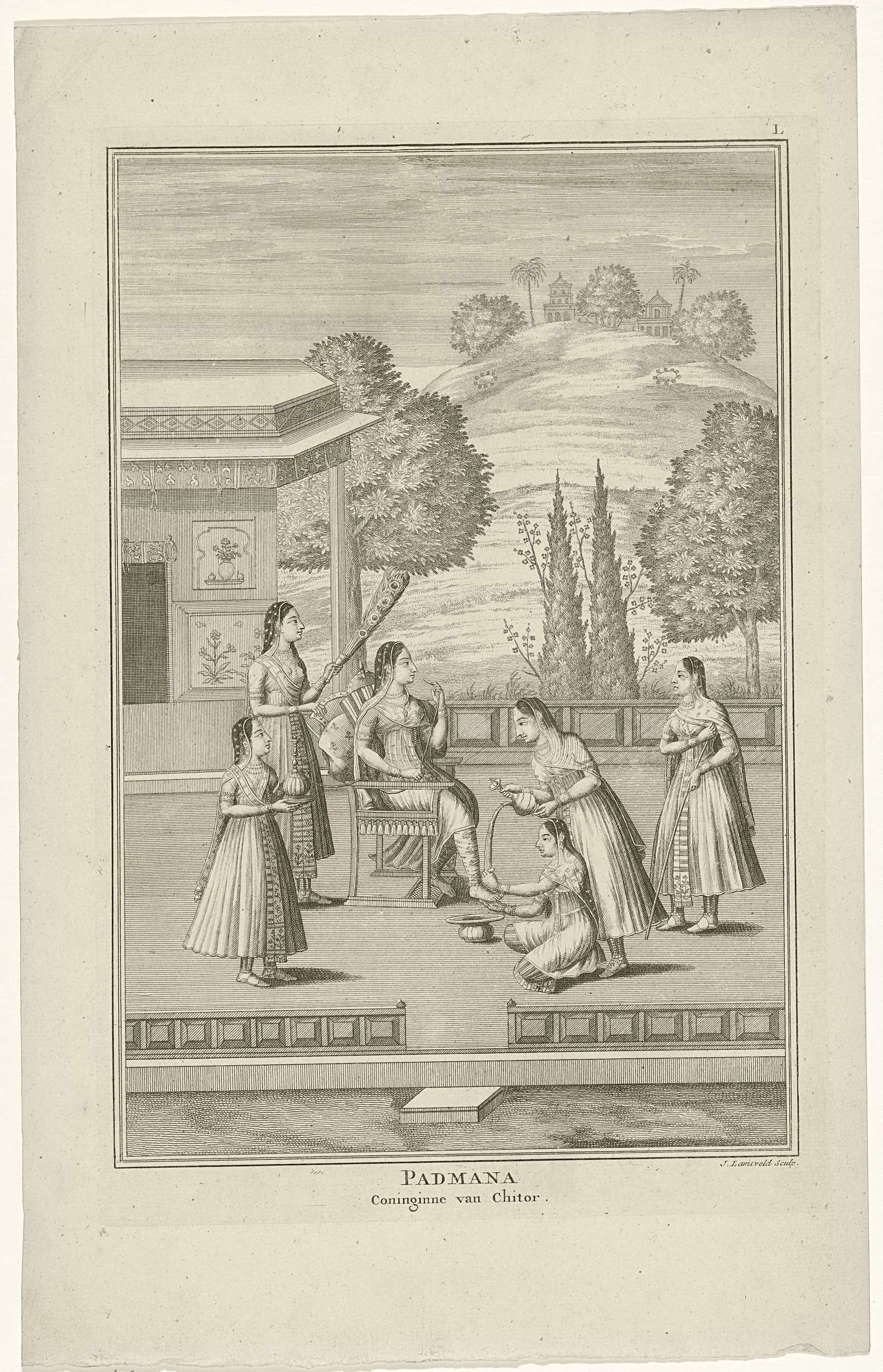 Rani Padmini, koningin van Chittor, rookt al zittend op een stoel de waterpijp die door een dienares wordt vastgehouden. Achter de koningin wuift een dienares met een bundel pauwenveren koelte toe, twee vrouwen wassen Padmini's voeten. Prent rechtsboven gemerkt: L.