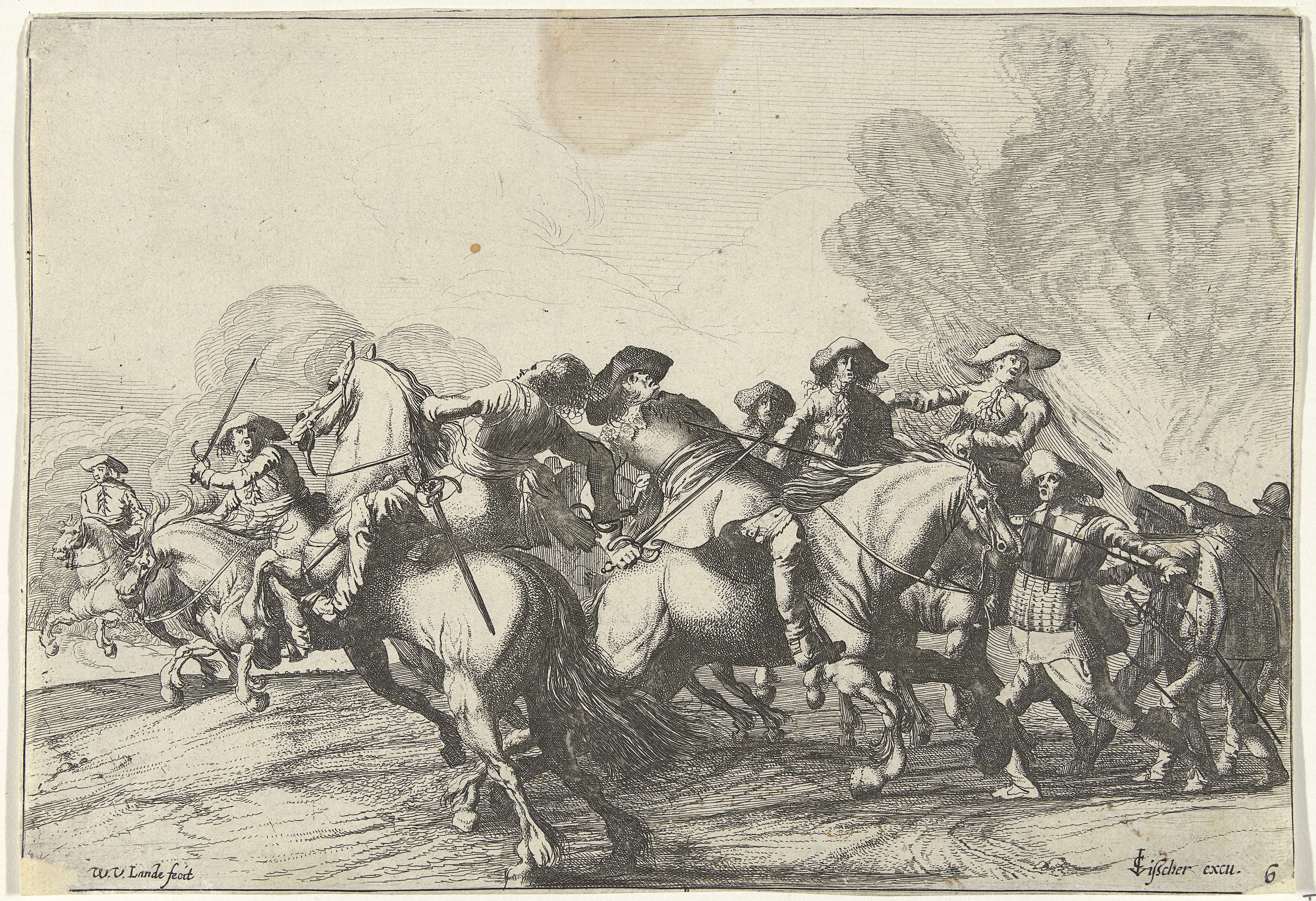 Slagveldscène waarin een ruiter met een speer wordt neergestoken. De prent maakt deel uit van een zesdelige serie prenten met ruitergevechten. Prent rechtsonder genummerd: 6.