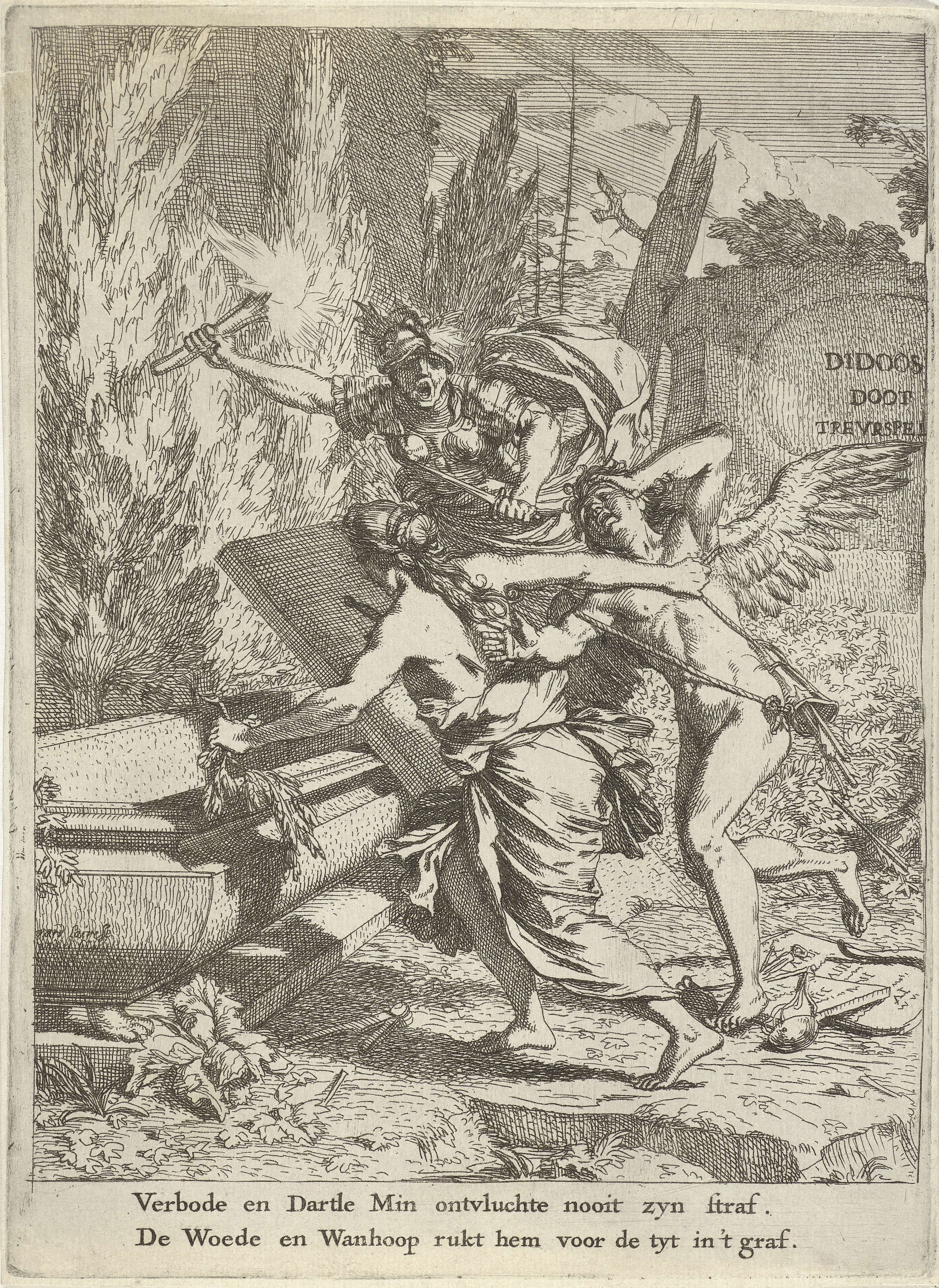 De Wanhoop trekt met een dolk in haar borst Amor naar een open graf. De met dolk gewapende Woede is bij het graf verschenen en houdt een brandende toorts vast. In de marge staat een tweeregelig onderschrift in het Nederlands. Deze illustratie is vervaardigd bij het treurspel "Didoos Doot" (1668), geschreven door Andries Pels. De ...