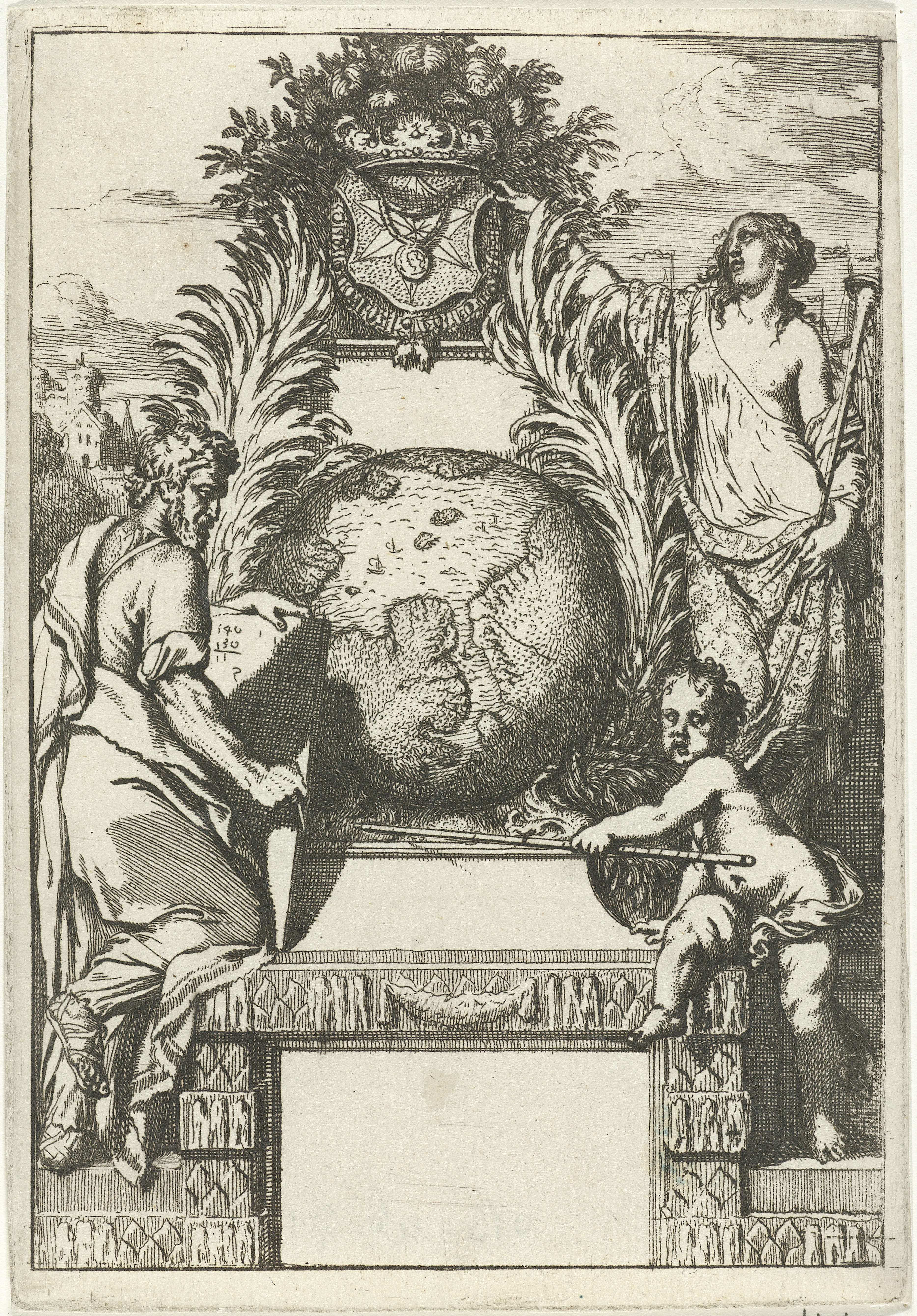 Een globe rust op een voetstuk en wordt geflankeerd door twee allegorische figuren. De figuur links schrijft cijfers op een tablet, de vrouwfiguur rechts draagt een bazuin en houdt het gekroonde wapen boven de globe vast. Rechts naast het voetsuk zit een putto met een meetstok.