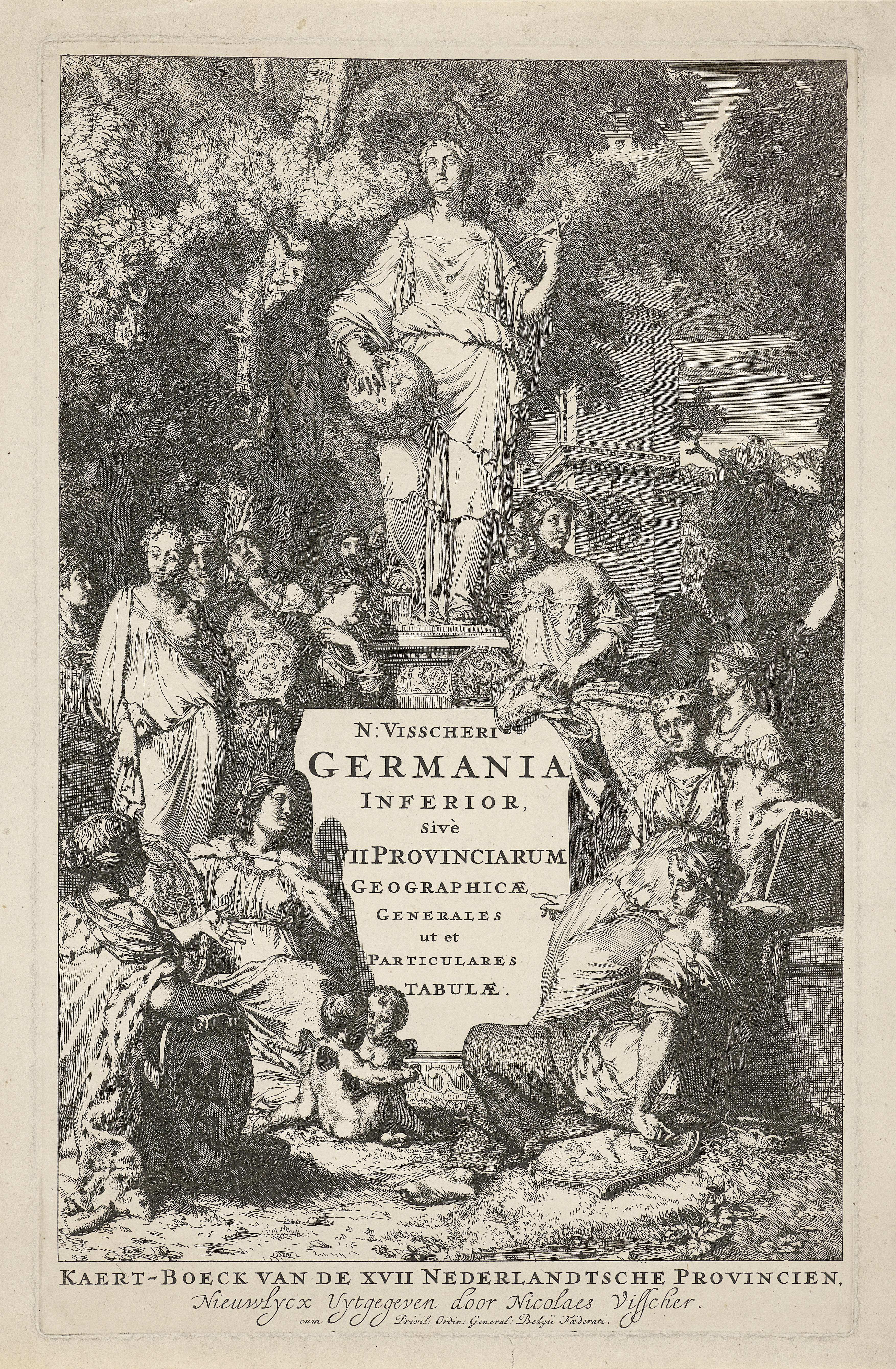 Het standbeeld van Geografia (passer en wereldbol) staat op een sokkel en wordt omringd door de personificaties van de Zeventien Provinciën. Een aantal van deze personificaties houdt het wapen van een provincie in de hand.
