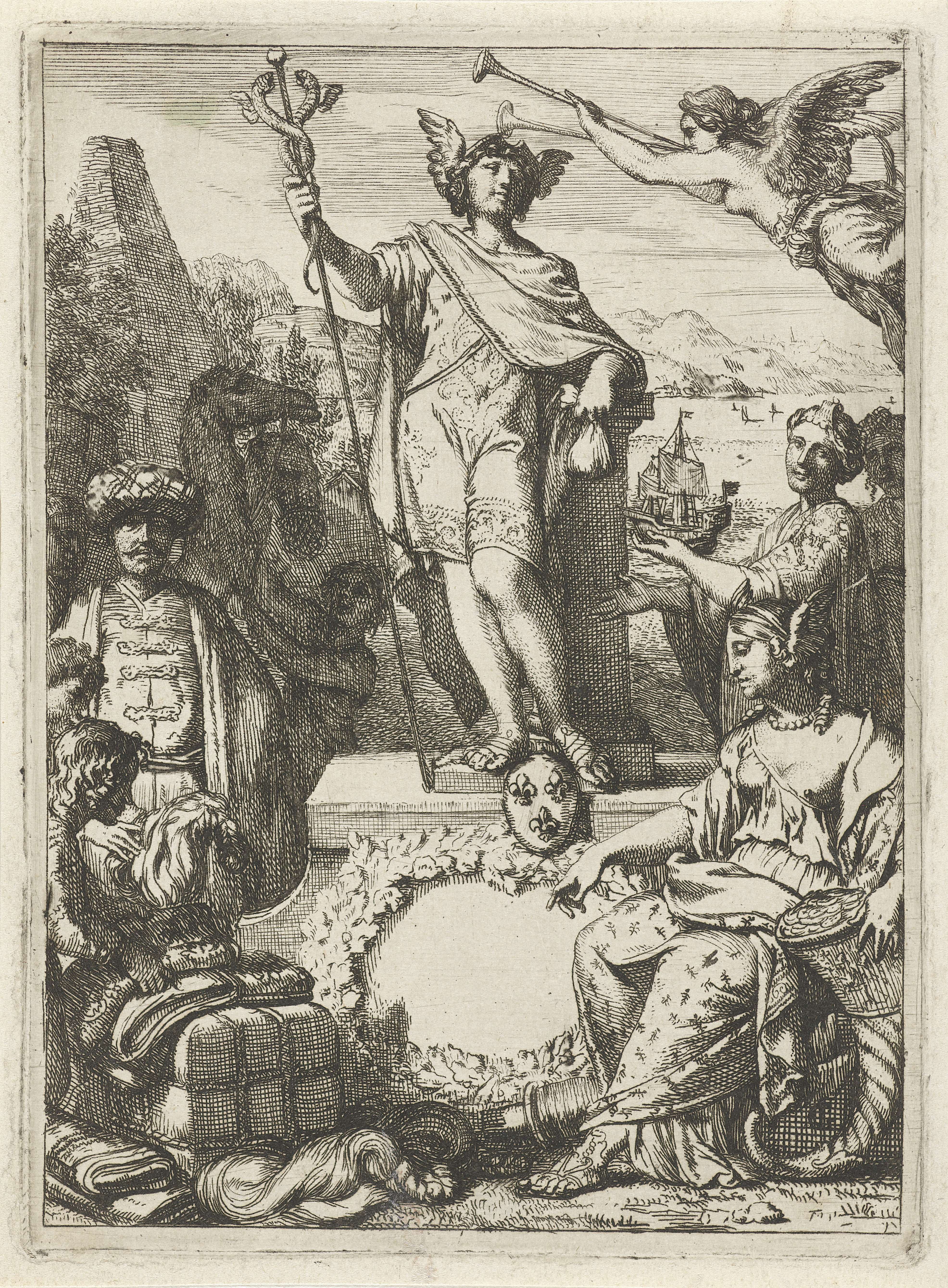 Mercurius staat op een voetstuk dat versierd is met het wapen van Frankrijk, de bazuin blazende Faam vliegt naast zijn hoofd. Op de voorgrond zit rechts de personifictie van Arbeid en Vlijt, gehuld in een kleed bezet met mieren. In haar linkerhand houdt ze een met geld gevulde hoorn vast. Links staat een Oosterse koopman ...