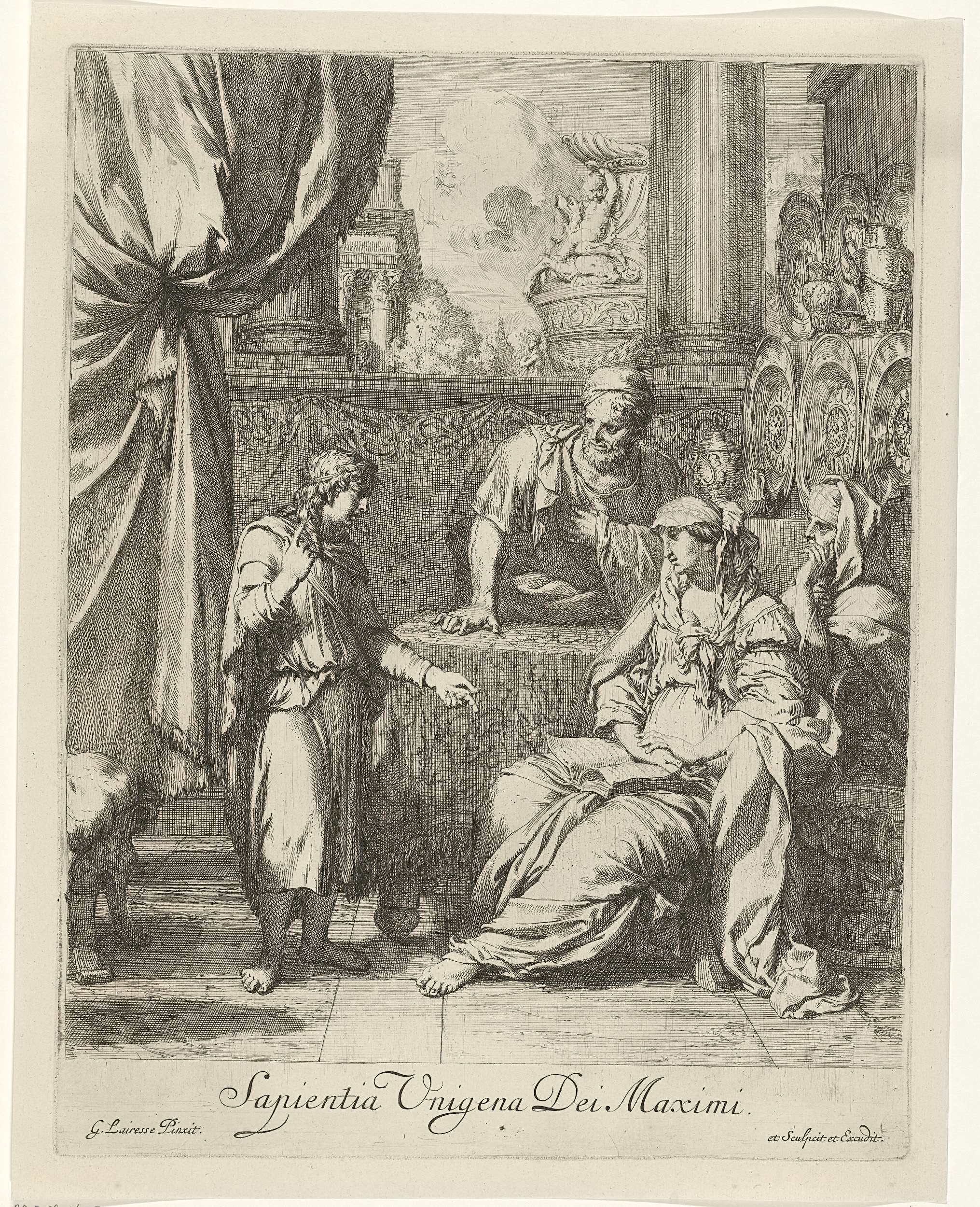 Deze scène komt in het Nieuwe Testament niet voor. Het tafereel lijkt losjes geënt op het verhaal van de twaalfjarige Jezus die de leraren in de tempel versteld deed staan van zijn wijsheid. Hier bestaat zijn gehoor uit zijn aardse ouders Jozef en Maria en grootmoeder Anna. Uitzonderlijk is ook het decor: een kostbaar gemeubileerd ...
