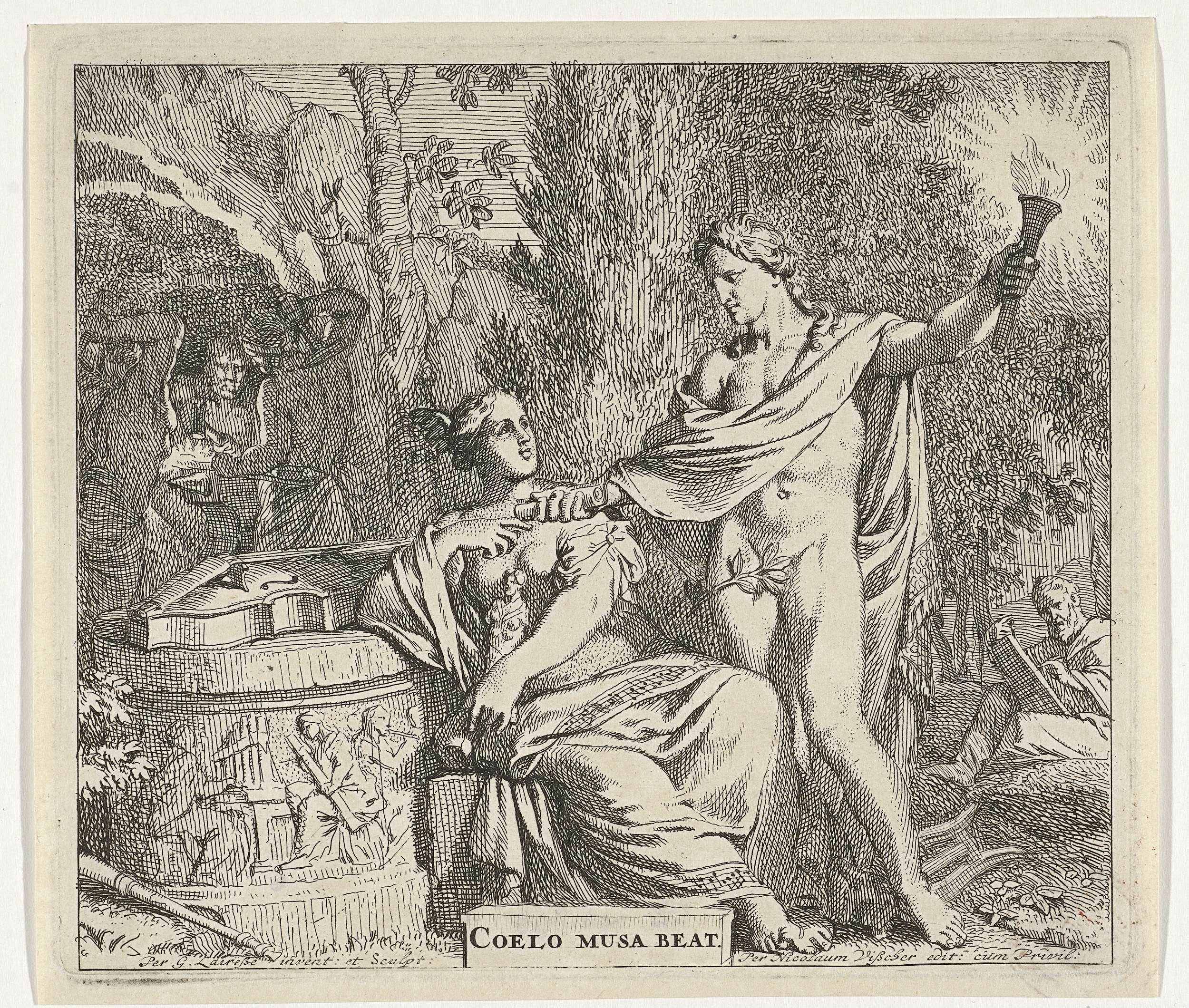 Apollo staat met een brandende fakkel naast een Muze die gehuld is in een met muzieknoten versierd kleed. Haar arm steunt op een zuil waarop een viola ligt, het reliëf van de zuil toont muziek spelende Muzen. Links op de achtergrond staan cyclopen met hamers rond een aambeeld, rechts zit een figuur te musiceren.