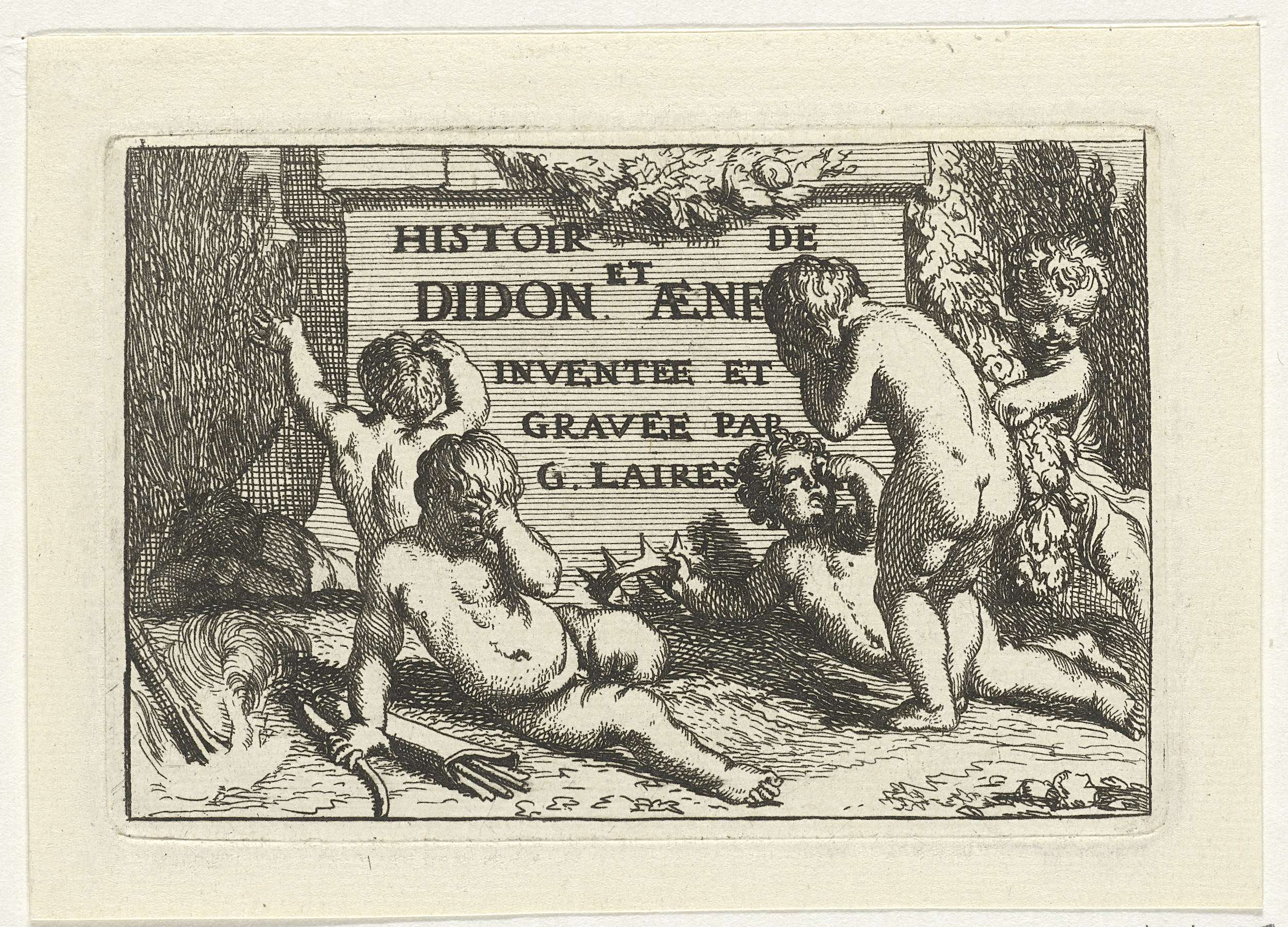 Zes putti treuren om de dood van Dido. De putto rechts van het midden houdt een kroon vast, links versiert een tweede putto de sokkel met een bloemguirlande. De prent maakt deel uit van een zesdelige serie prenten met scènes uit het mythologische verhaal van Dido en Aeneas.