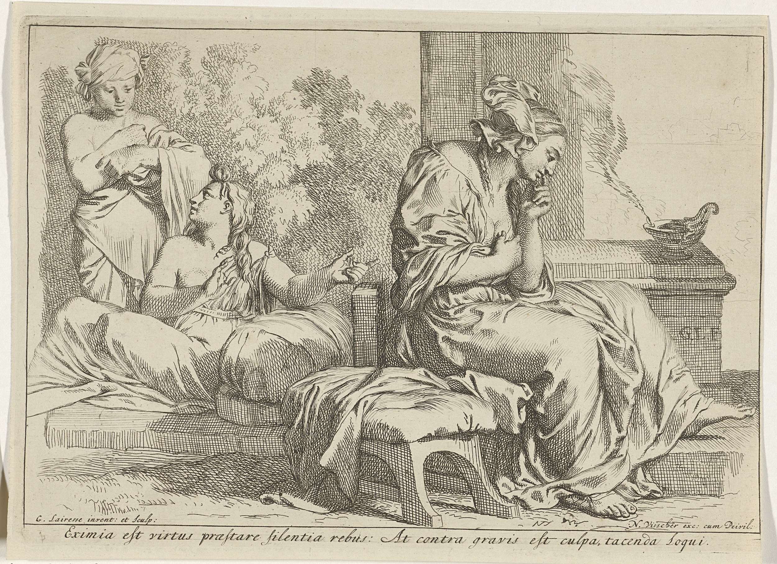 De personificatie van zwijgzaamheid zit naast een rokende olielamp te peinzen. De twee figuren links personificeren de spraakzaamheid. De zittende figuur van dit tweetal wijst naar de peinzende Zwijgzaamheid en lijkt over haar te praten.