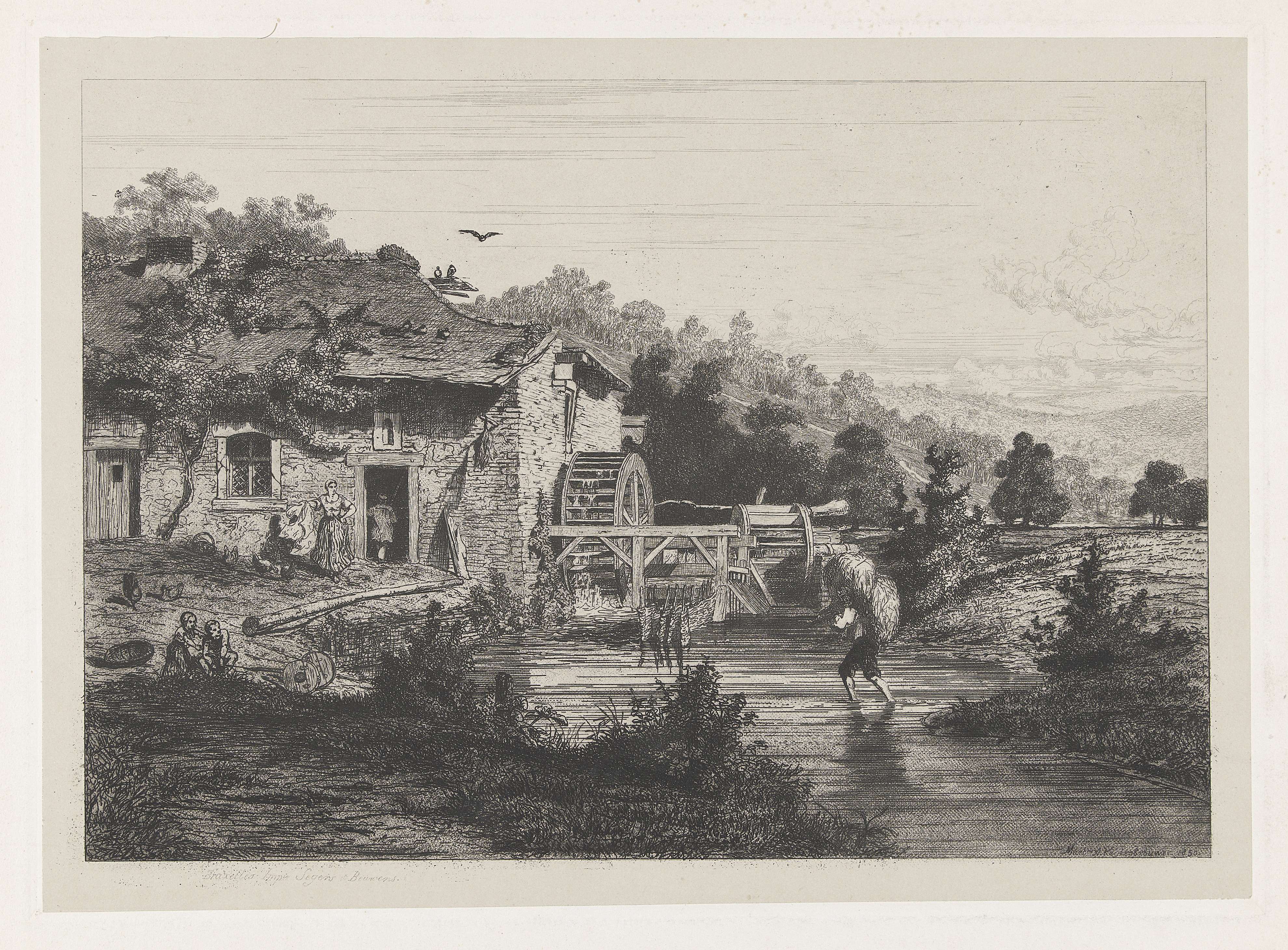 Landschap met een watermolen aan een beek. In de beek loopt een man met een baal hooi op zijn rug. Op het erf voor de molen staat een boerin en lopen een paar kippen. Aan de waterkant twee spelende kinderen.