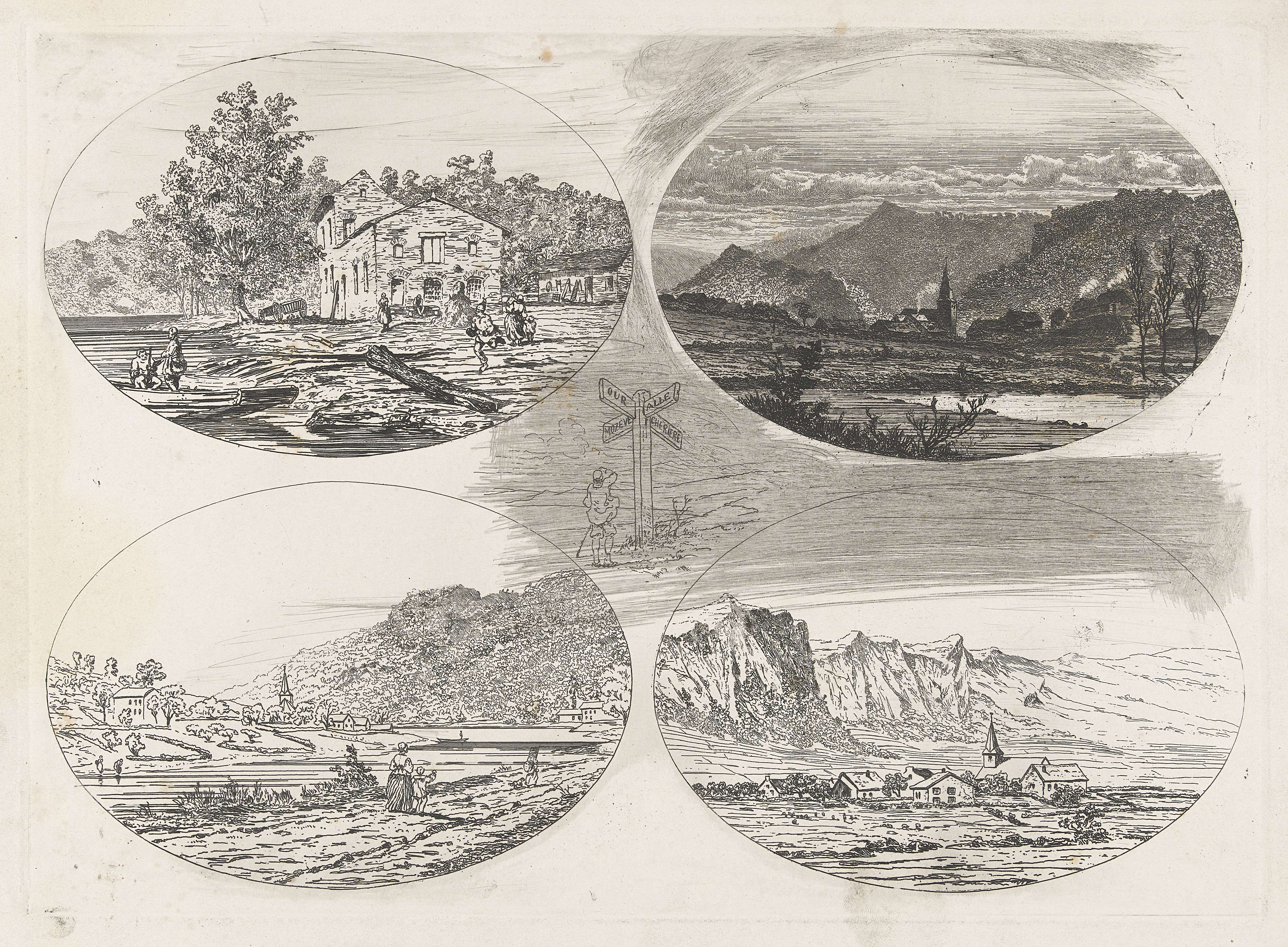 Blad met vier medaillons met gezichten op Belgische dorpen. Linksboven een medaillon met een gezicht op het dorp Ouren aan de rivier de Our en rechtsboven het dorp Alle met de contouren van de Sint-Mauruskerk. Linksonder een medaillon met een gezicht op Mouzaive aan de rivier de Semois en rechtsonder het dorp Chairière en de ...