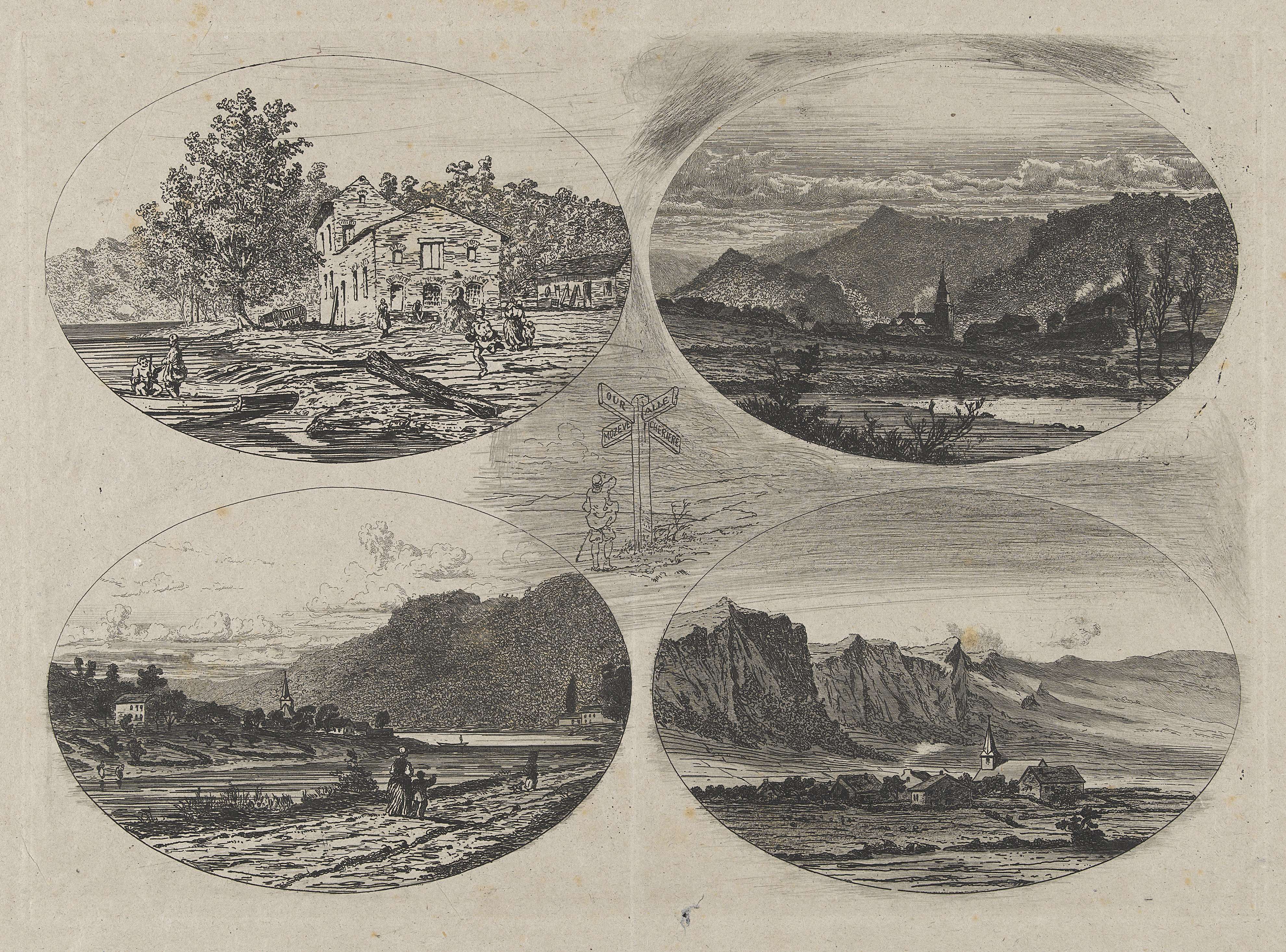 Blad met vier medaillons met gezichten op Belgische dorpen. Linksboven een medaillon met een gezicht op het dorp Ouren aan de rivier de Our en rechtsboven het dorp Alle met de contouren van de Sint-Mauruskerk. Linksonder een medaillon met een gezicht op Mouzaive aan de rivier de Semois en rechtsonder het dorp Chairière en de ...