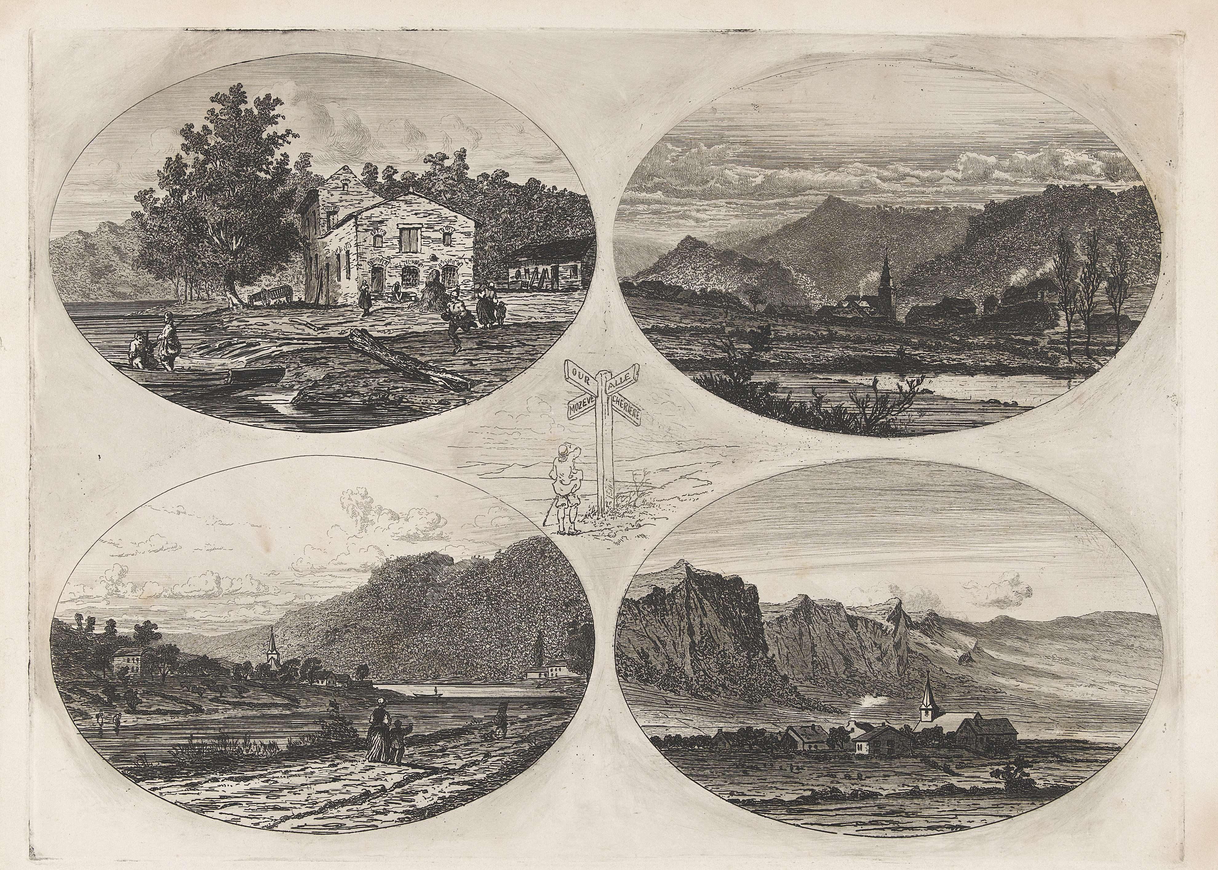 Blad met vier medaillons met gezichten op Belgische dorpen. Linksboven een medaillon met een gezicht op het dorp Ouren aan de rivier de Our en rechtsboven het dorp Alle met de contouren van de Sint-Mauruskerk. Linksonder een medaillon met een gezicht op Mouzaive aan de rivier de Semois en rechtsonder het dorp Chairière en de ...