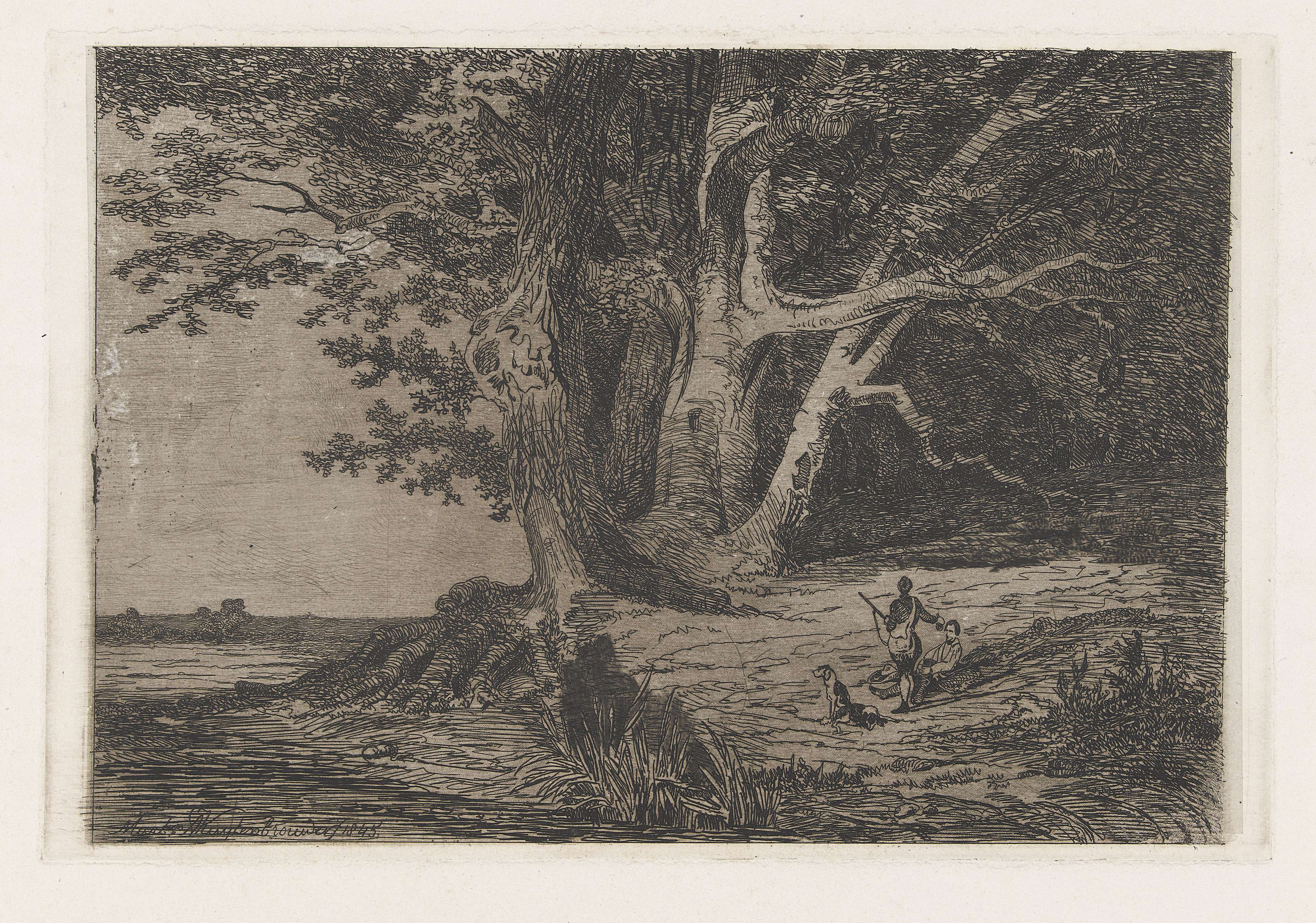 Aan een waterkant, waar een grote boom staat, bevinden zich twee rustende jagers en hun twee honden.