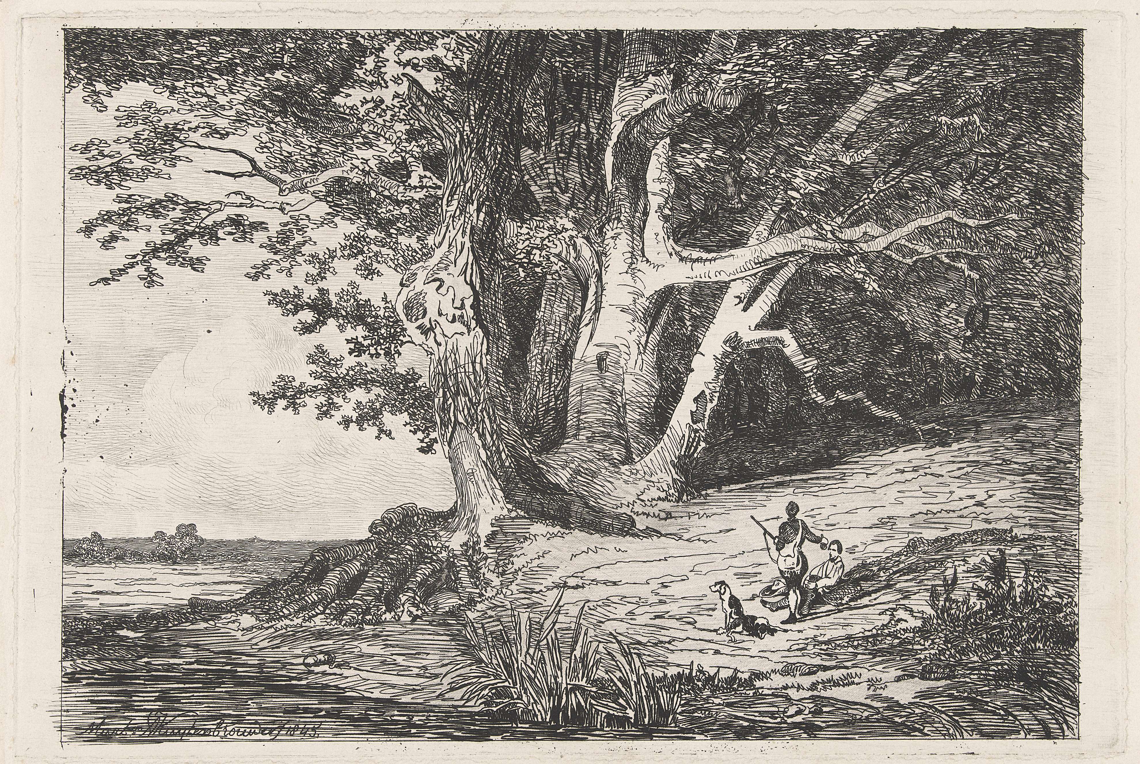 Aan een waterkant, waar een grote boom staat, bevinden zich twee rustende jagers en hun twee honden.