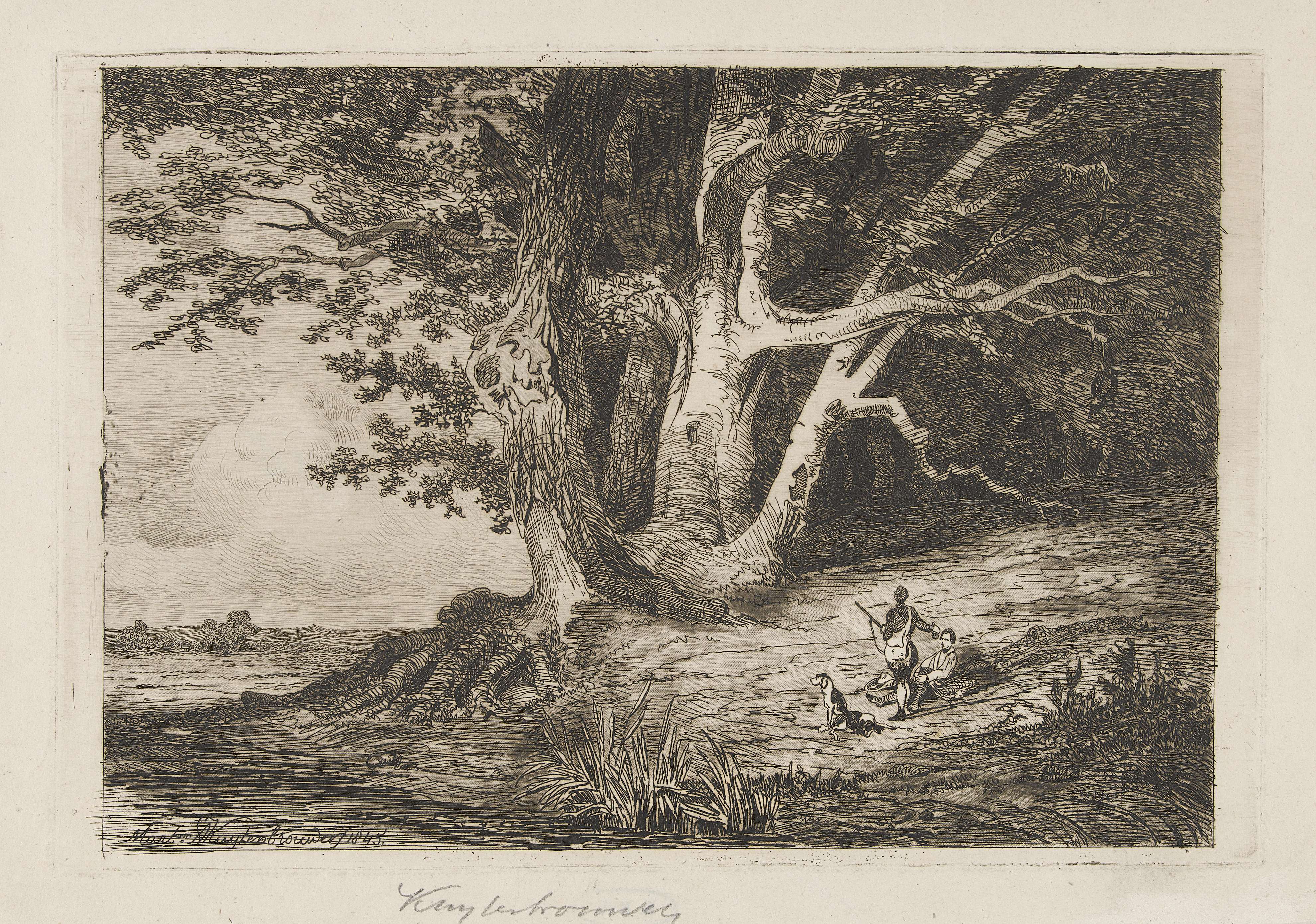 Aan een waterkant, waar een grote boom staat, bevinden zich twee rustende jagers en hun twee honden.