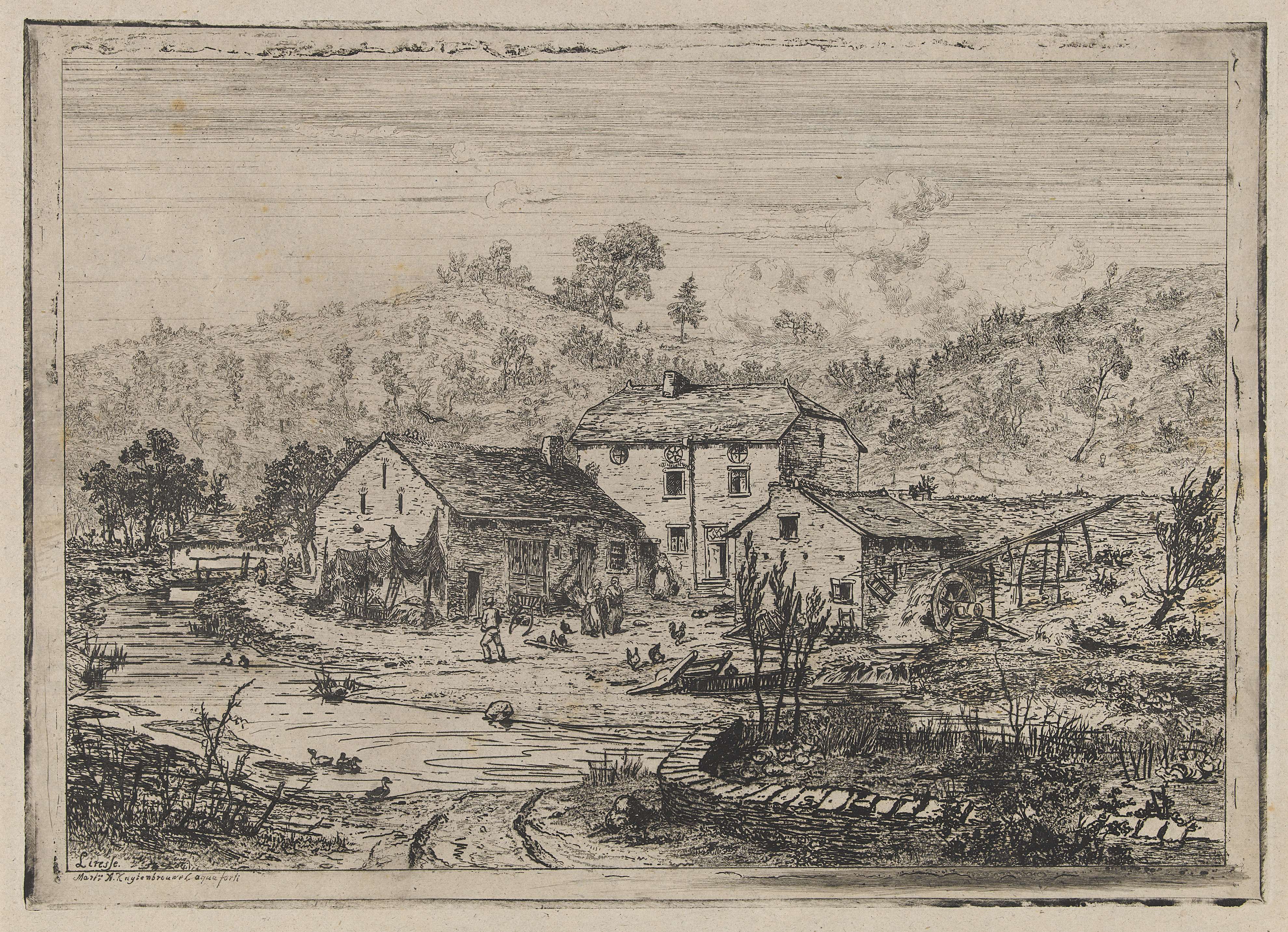 In een heuvelachtig landschap ligt een boerderij aan de rand van een smalle rivier. Rechts draait een watermolen op volle toeren en op het erf, waar pluimvee scharrelt, lopen drie boerinnen en een boer.