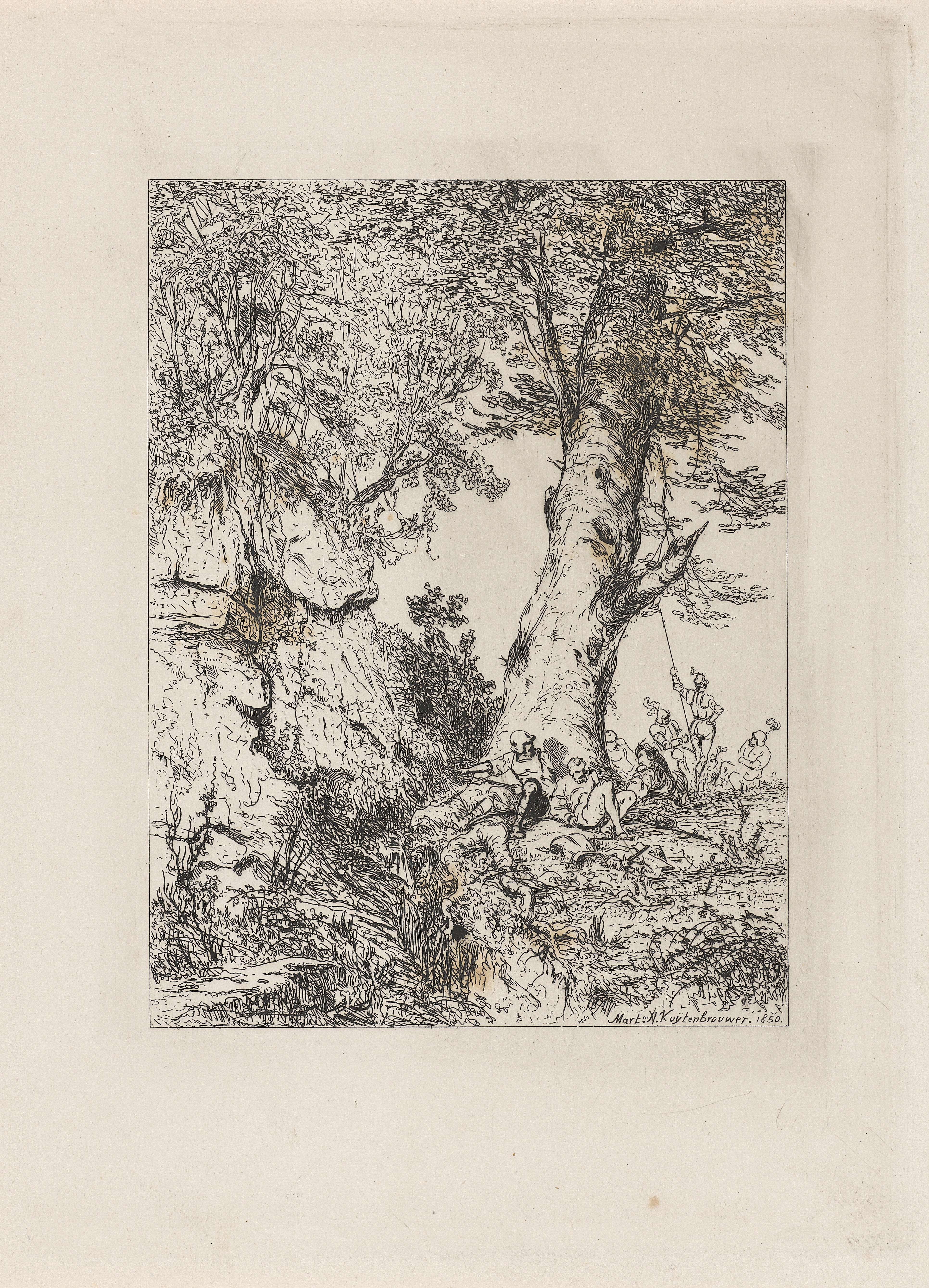In een bergachtig landschap bevinden zich een aantal soldaten onder een boom.