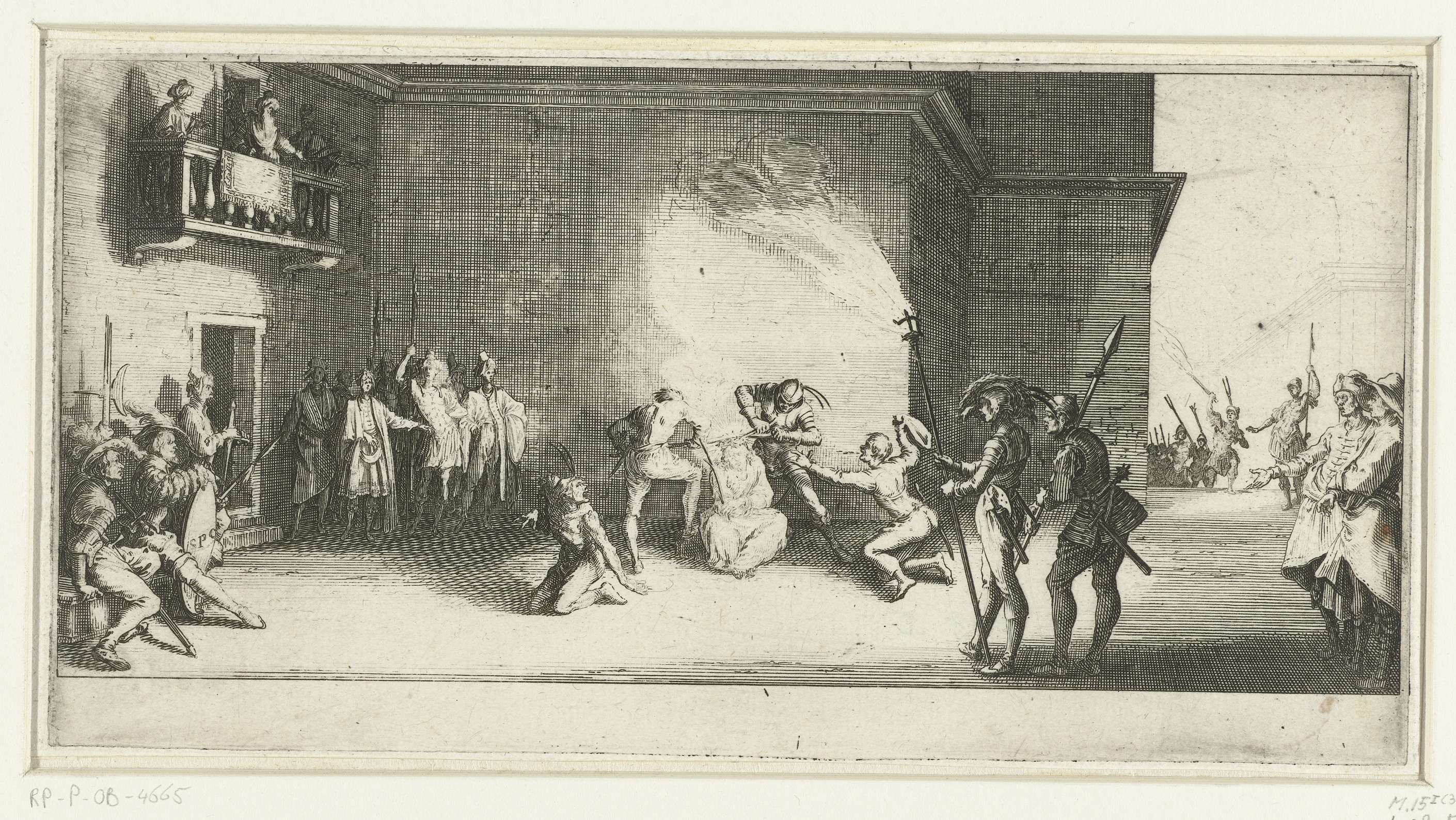 Soldaten duwen Christus, zittend voor een gebouw, een doornenkroon op het hoofd. Vanaf een balkon kijken drie mannen toe. Deze prent is onderdeel van de onvoltooide prentserie 'De grote Passie', bestaande uit 7 scènes uit het Lijdensverhaal.