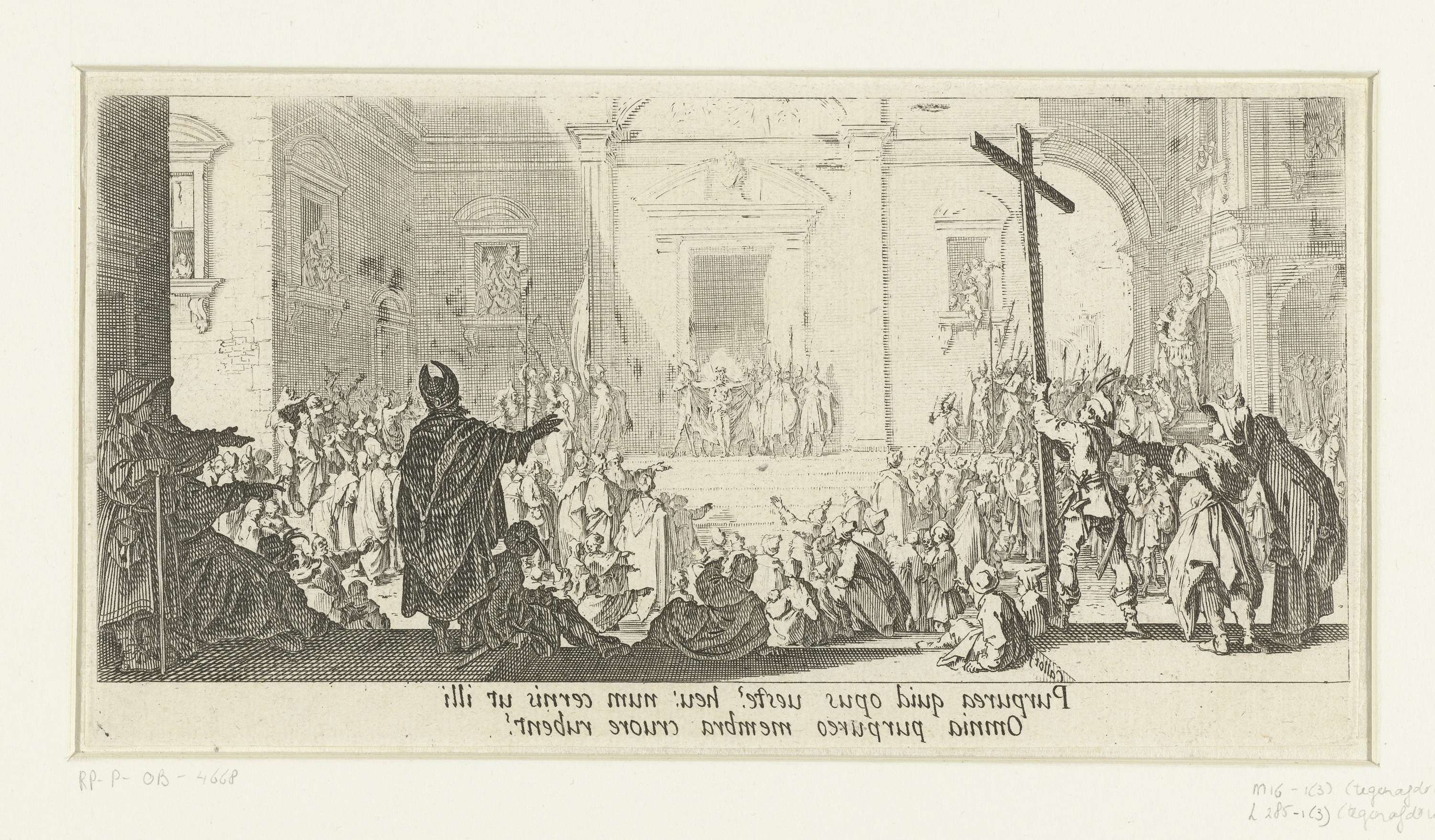 Christus wordt, staand op een bordes, aan een joelende menigte mensen getoond. Deze prent is een tegenafdruk (contre-épreuve) van een prent die onderdeel is van de onvoltooide prentserie 'De grote Passie', bestaande uit 7 scènes uit het Lijdensverhaal.