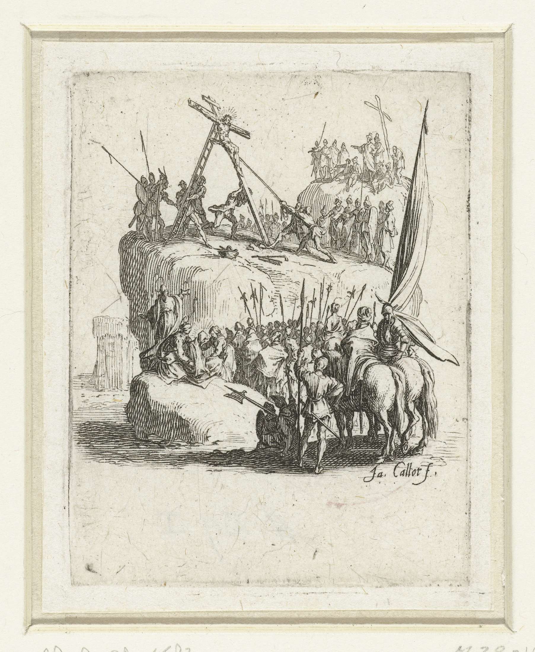 Het kruis met Christus eraan wordt door een aantal mannen overeind getrokken/geduwd. Enkele groepen mensen kijken toe. Deze prent is onderdeel van de prentserie 'De kleine Passie', bestaande uit 12 scènes uit het Lijdensverhaal.