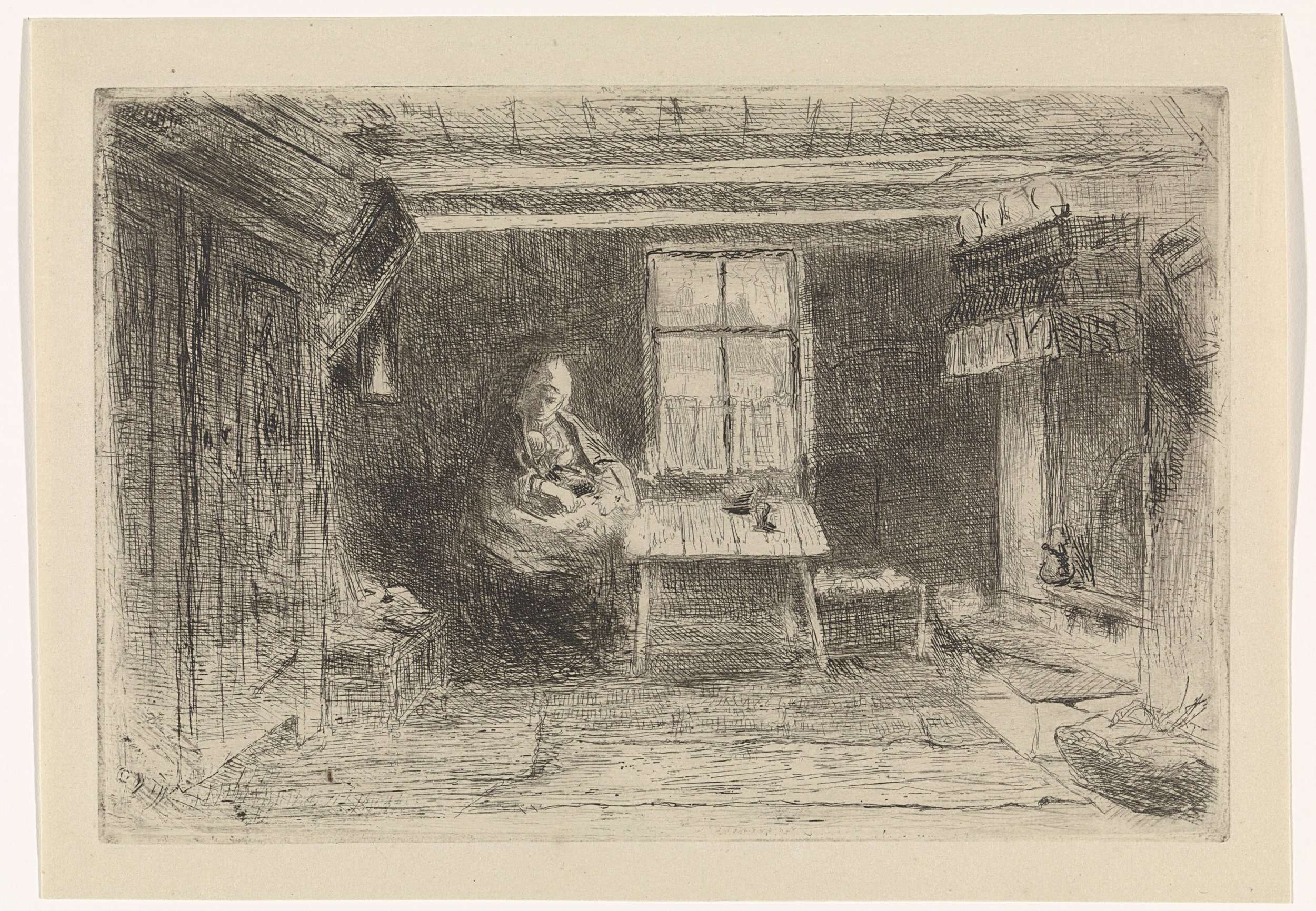 Interieur met moeder met kind op schoot, zittend aan een tafel bij een raam. Rechts een schouw met mand met brandhout en links een kast met stoel ernaast.