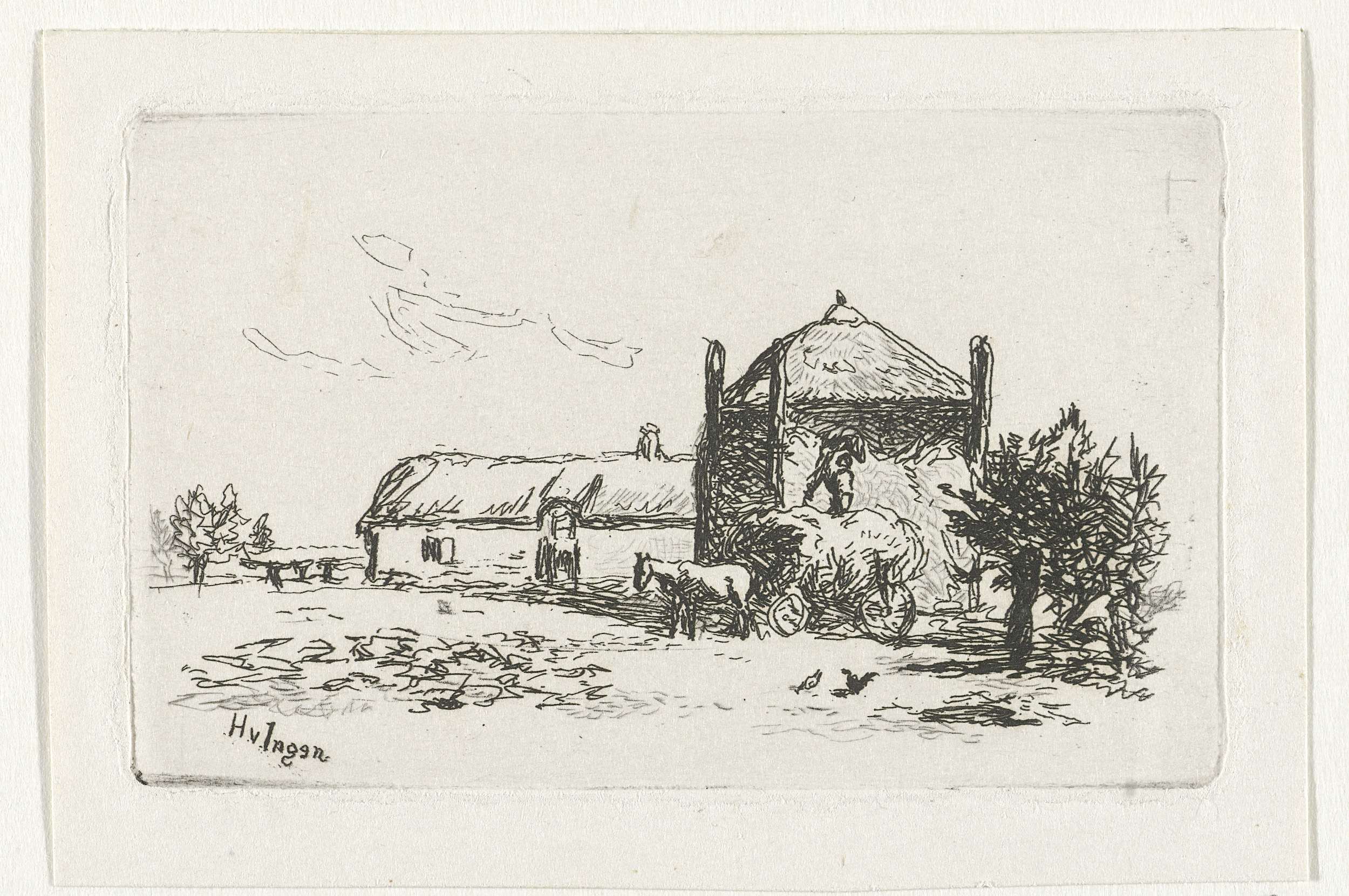 Een boerderij met hooiberg. Voor de hooiberg staan een paard en wagen met hooi. Op de wagen staat een man, die het hooi optast.