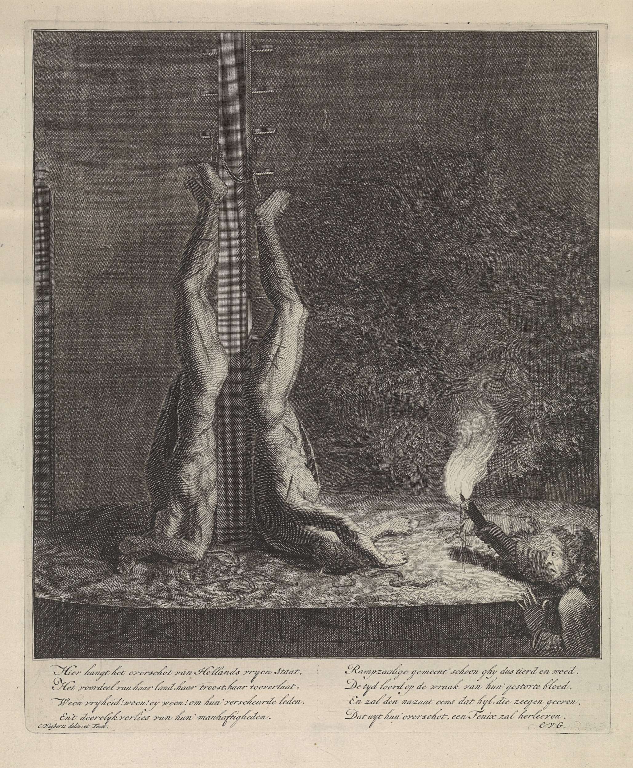 De verminkte lichamen van Johan en Cornelis de Witt hangend aan een paal. Rechts een man met een toorts, die de lijken gadeslaat. Onder een achtregelig vers in het Nederlands.
