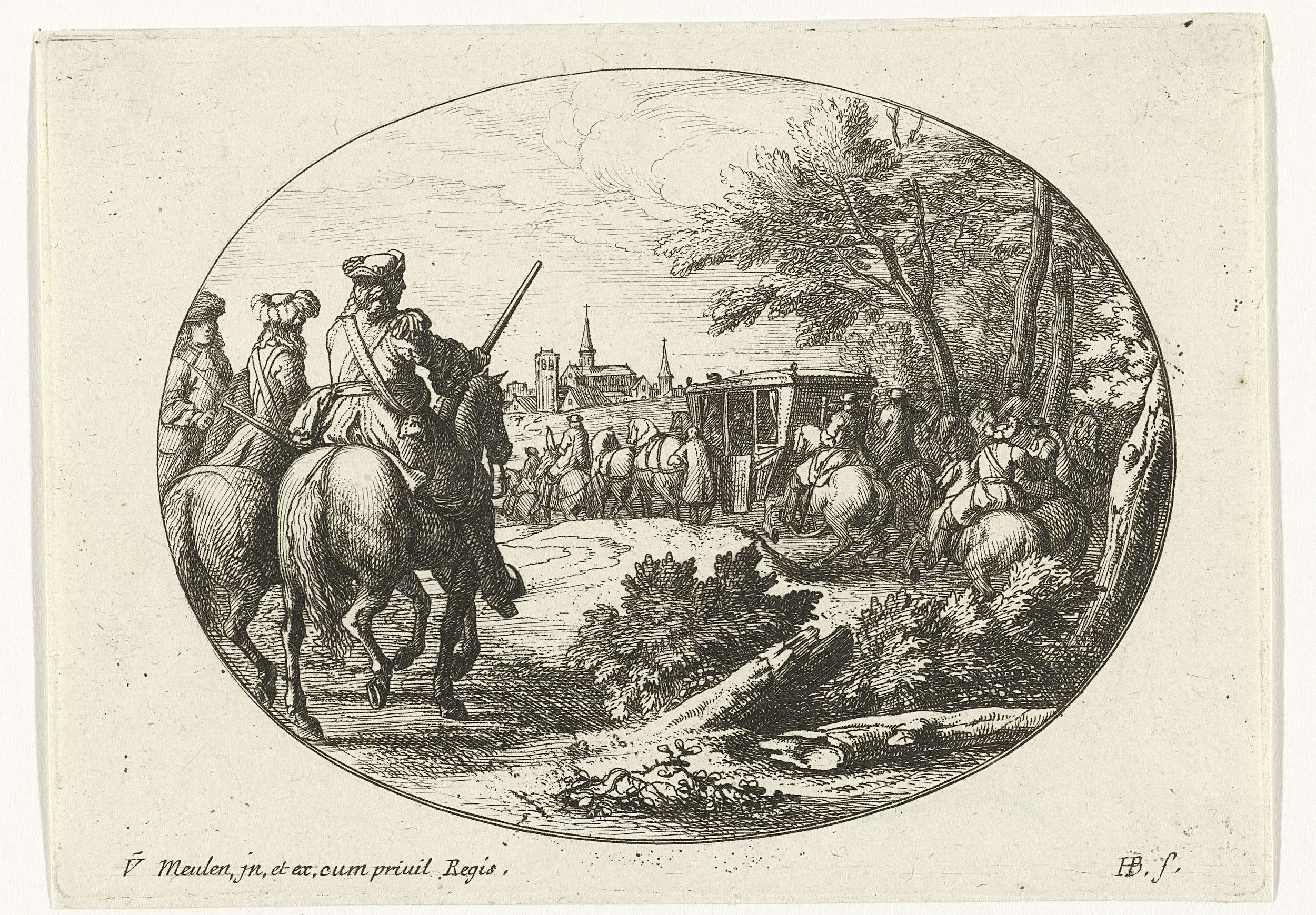 Links drie ruiters. Van rechts naar links een stoet ruiters, paarden en een koets, die naar een stad aan de horizon trekken.