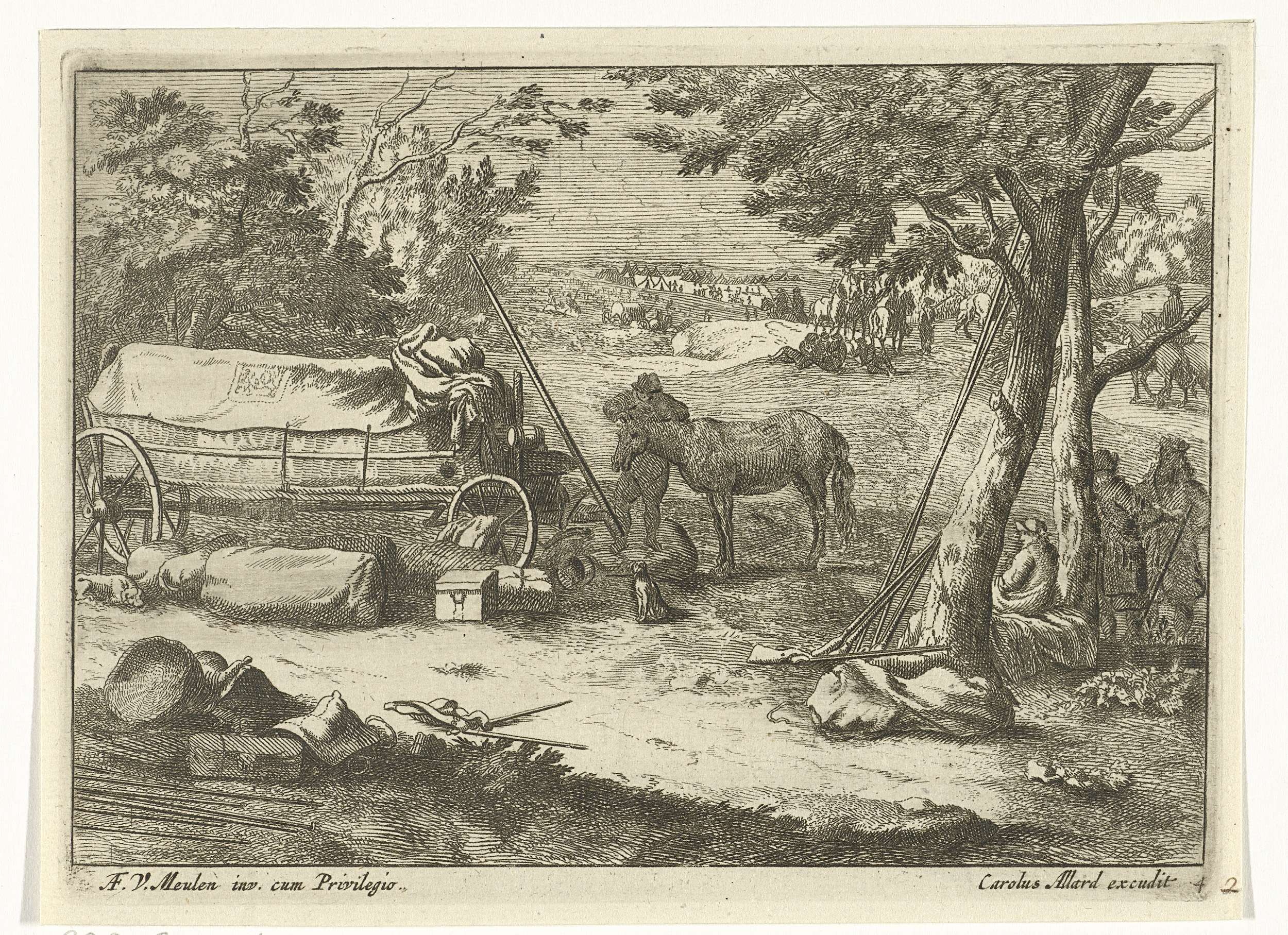 Links een kar, in het midden een man bij een paard. Rechts rustende soldaten bij twee bomen, geweren tegen de boom aan. Op de achtergrond cavalerie.