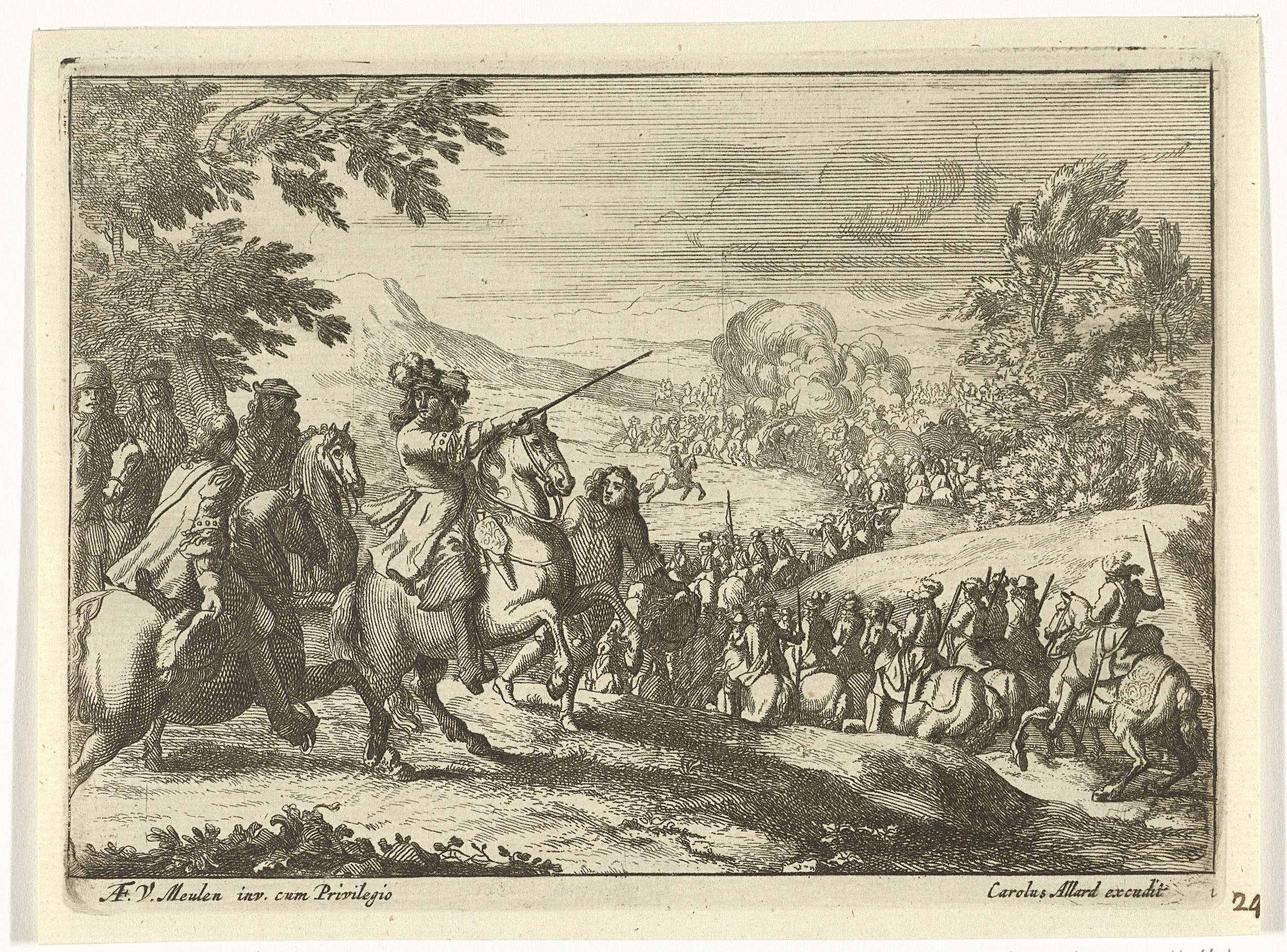 Links twee ruiters te paard in een landschap. Een stoet paarden en ruiters op de rug gezien. Aan de horizon een rookwolk.