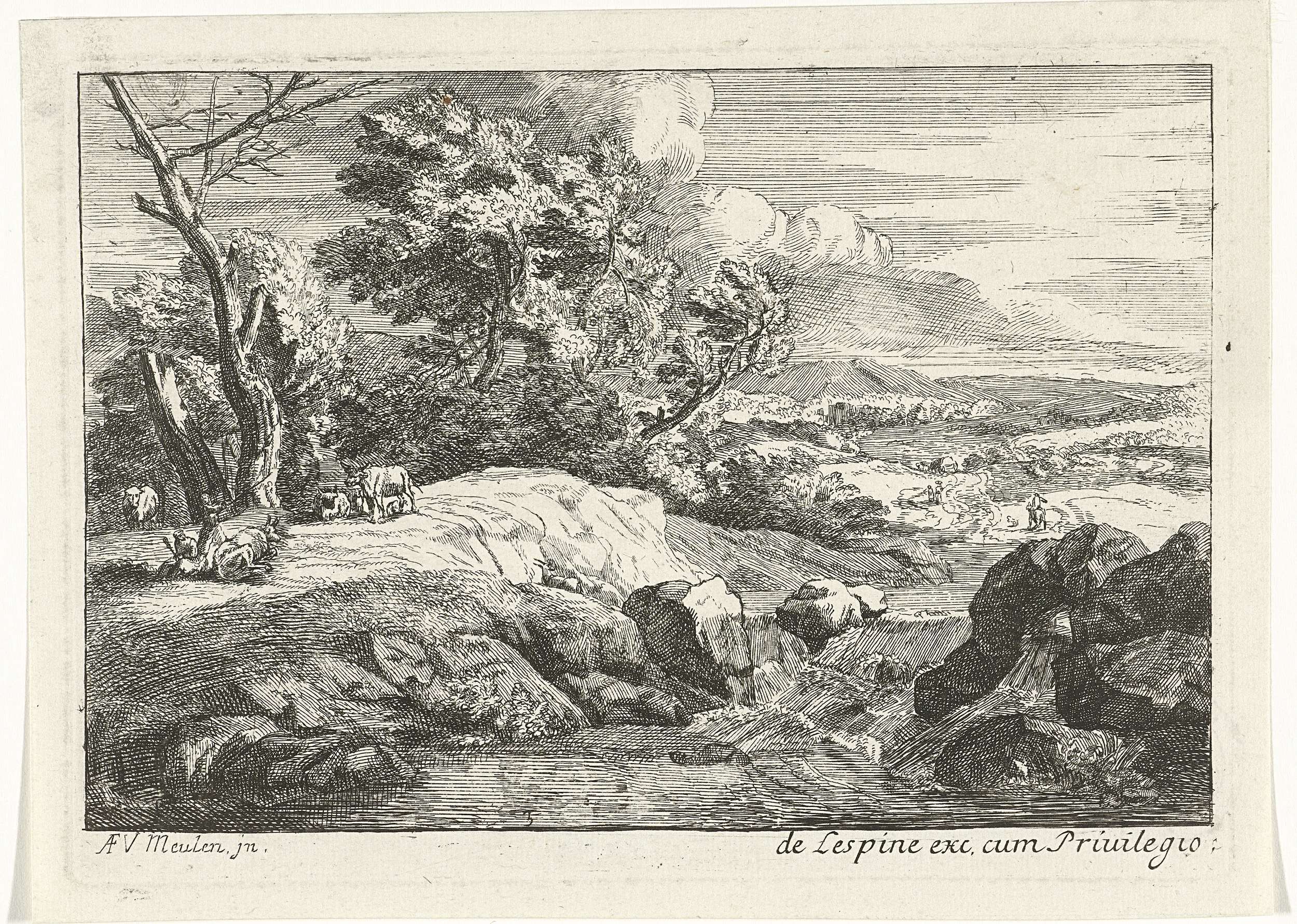 Landschap met links twee figuren en koeien voor een bossage. Rechtsachter een ruiter.