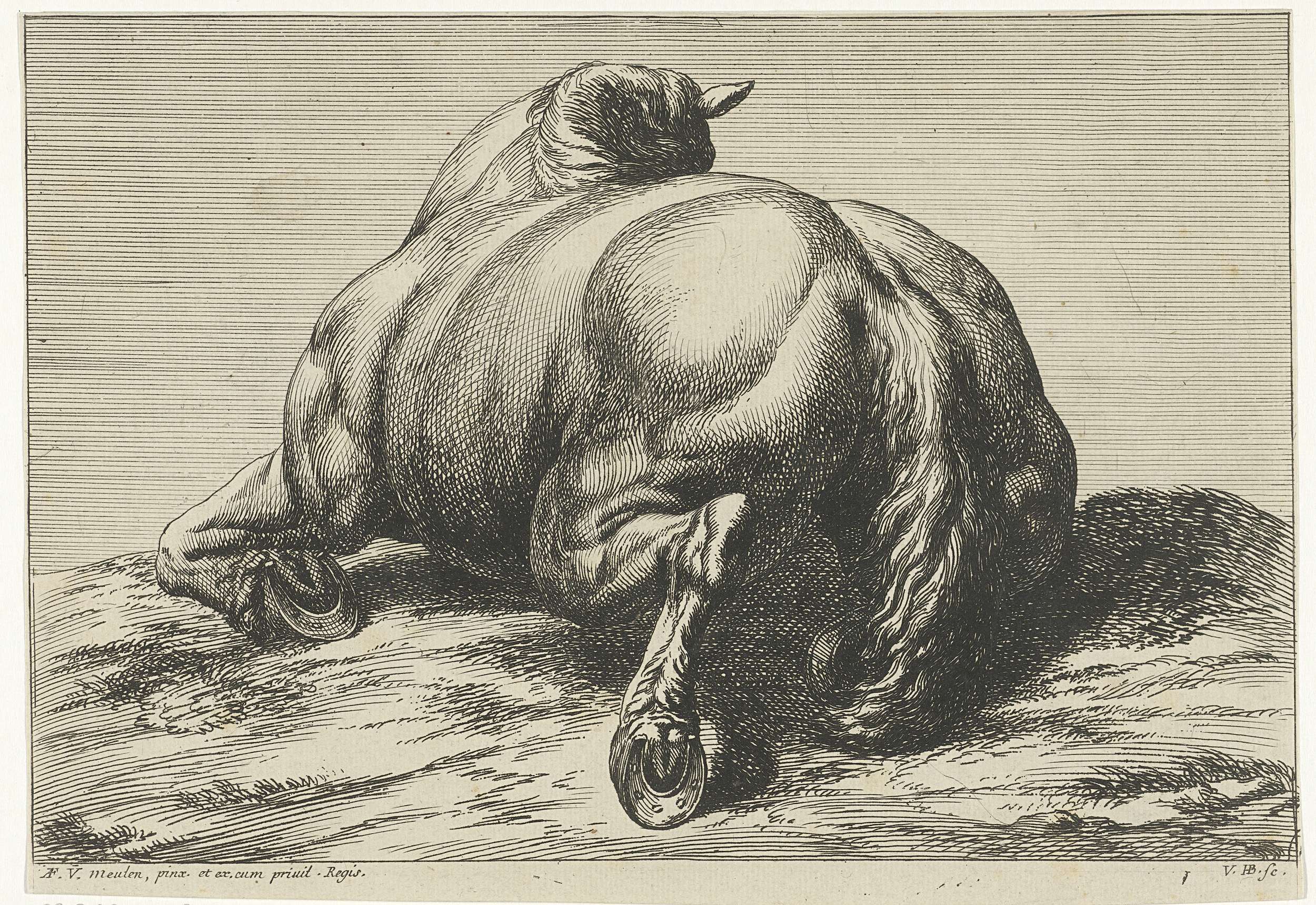 Gesneuveld paard op de buik van achter gezien