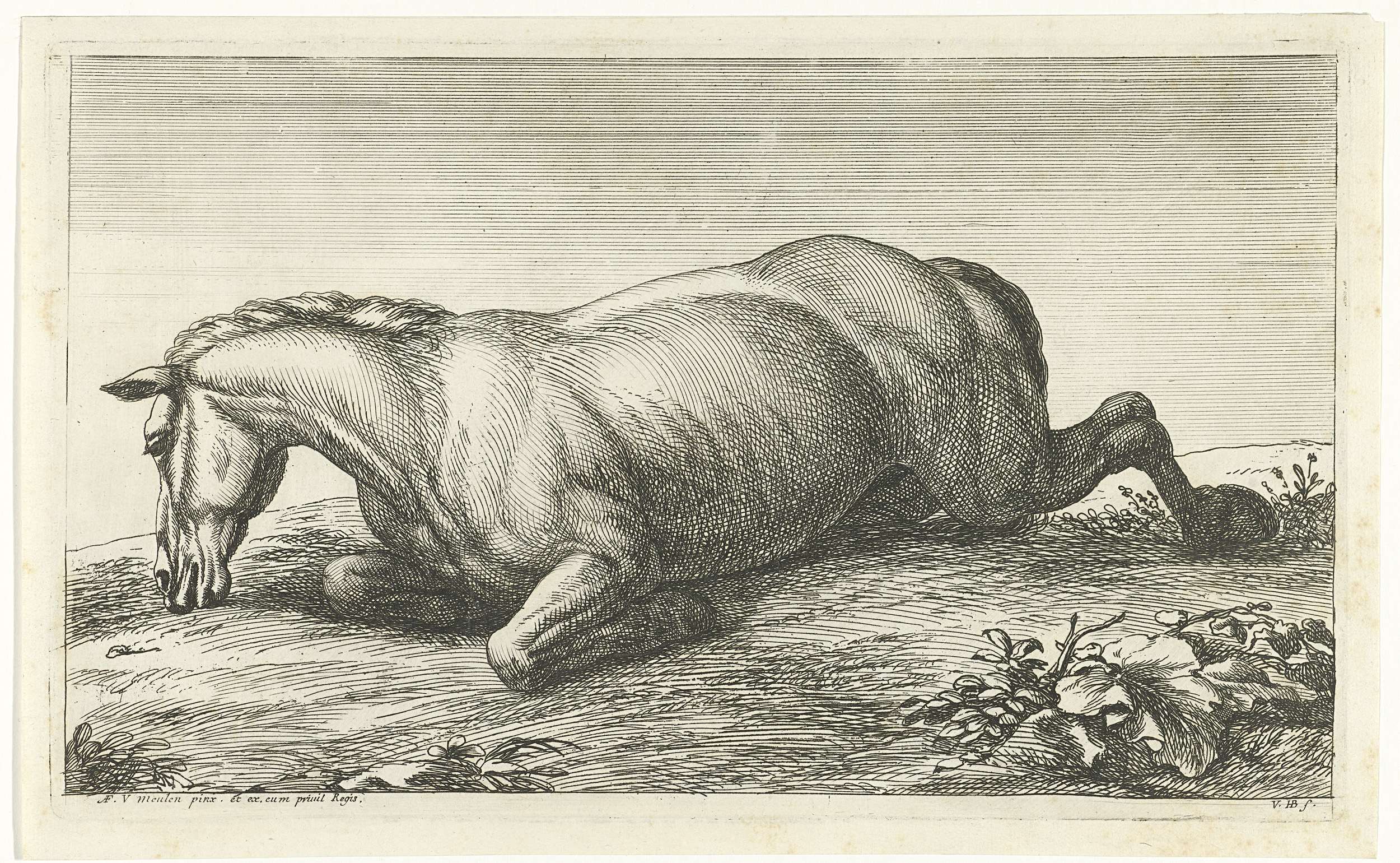 Gesneuveld paard op de buik liggend