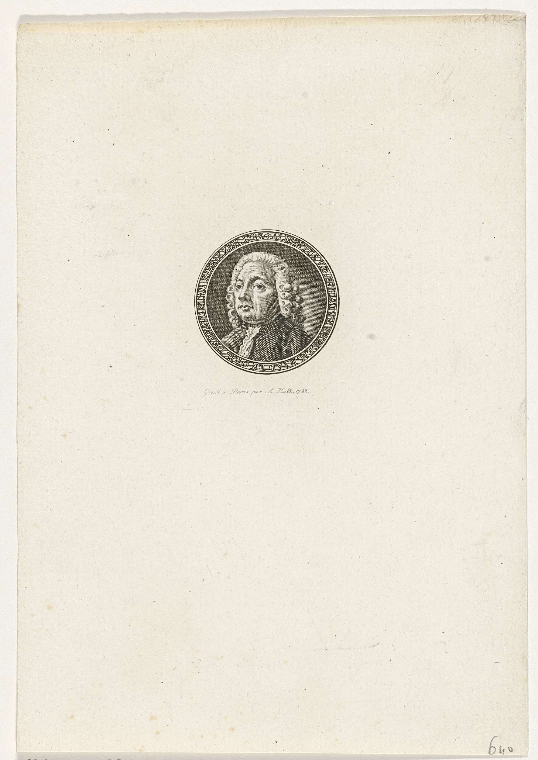Buste van Albertus van der Schatte naar links in een medaillon met randtekst in het Nederlands.