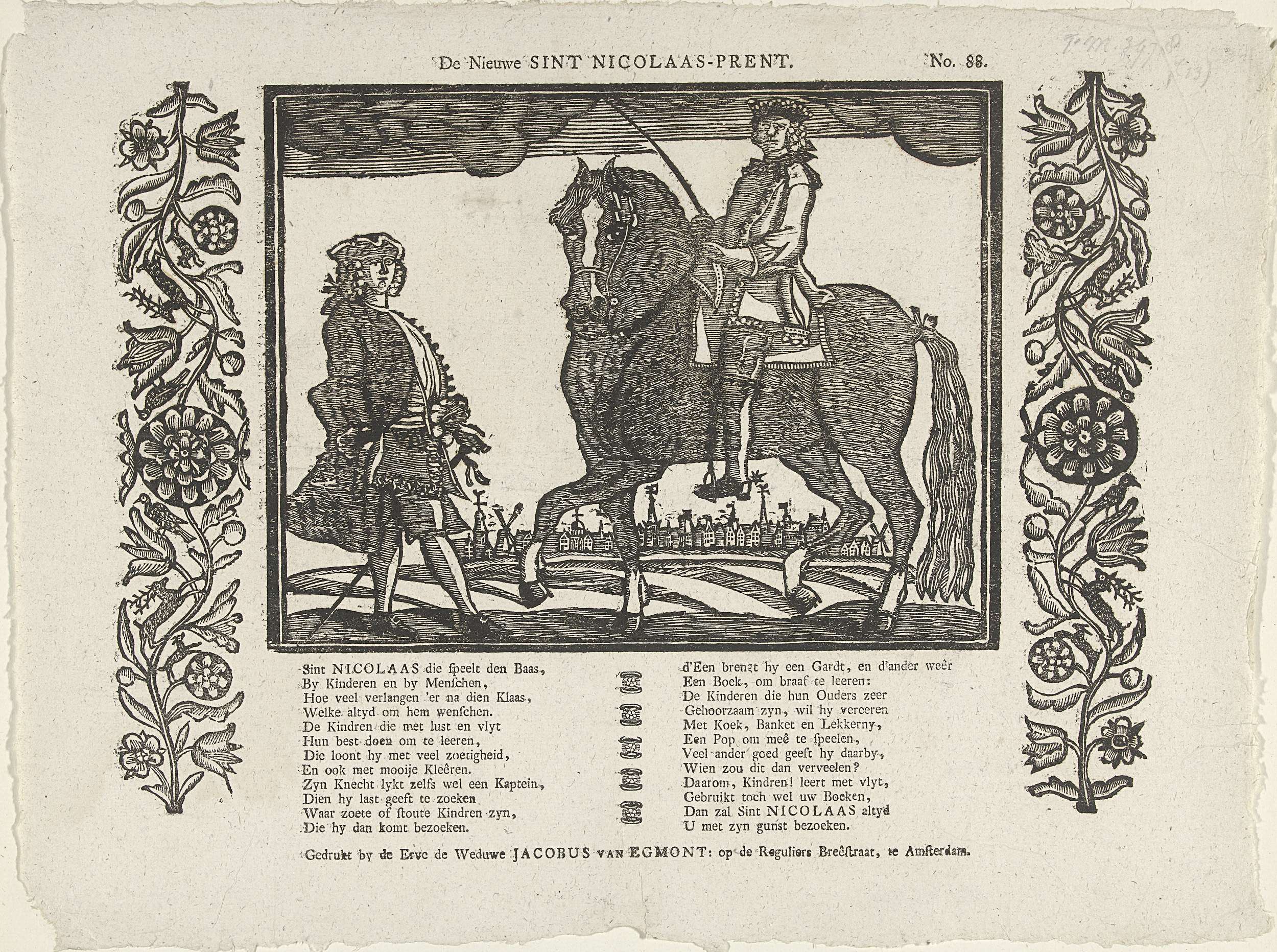 Blad met een officier of vorst te paard en een man staande naast het paard. Op de achtergrond het profiel van een stad. Onder de voorstelling een vers in twee kolommen over Sint Nicolaas. Aan weerszijden twee decoratieve stroken met bloemranken. Genummerd rechtsboven: No. 88.