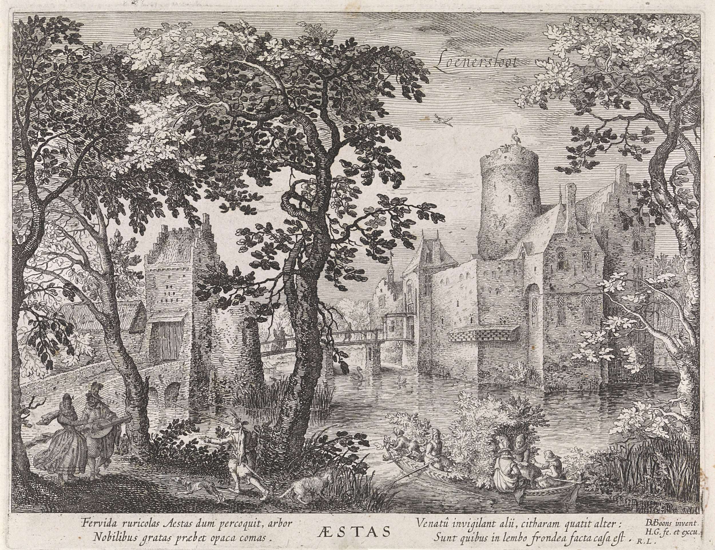 Het seizoen zomer. Een elegant gezelschap vermaakt zich in een bootje en met muziek bij kasteel Loenersloot. Met onderschrift van 4 regels in het Latijn.