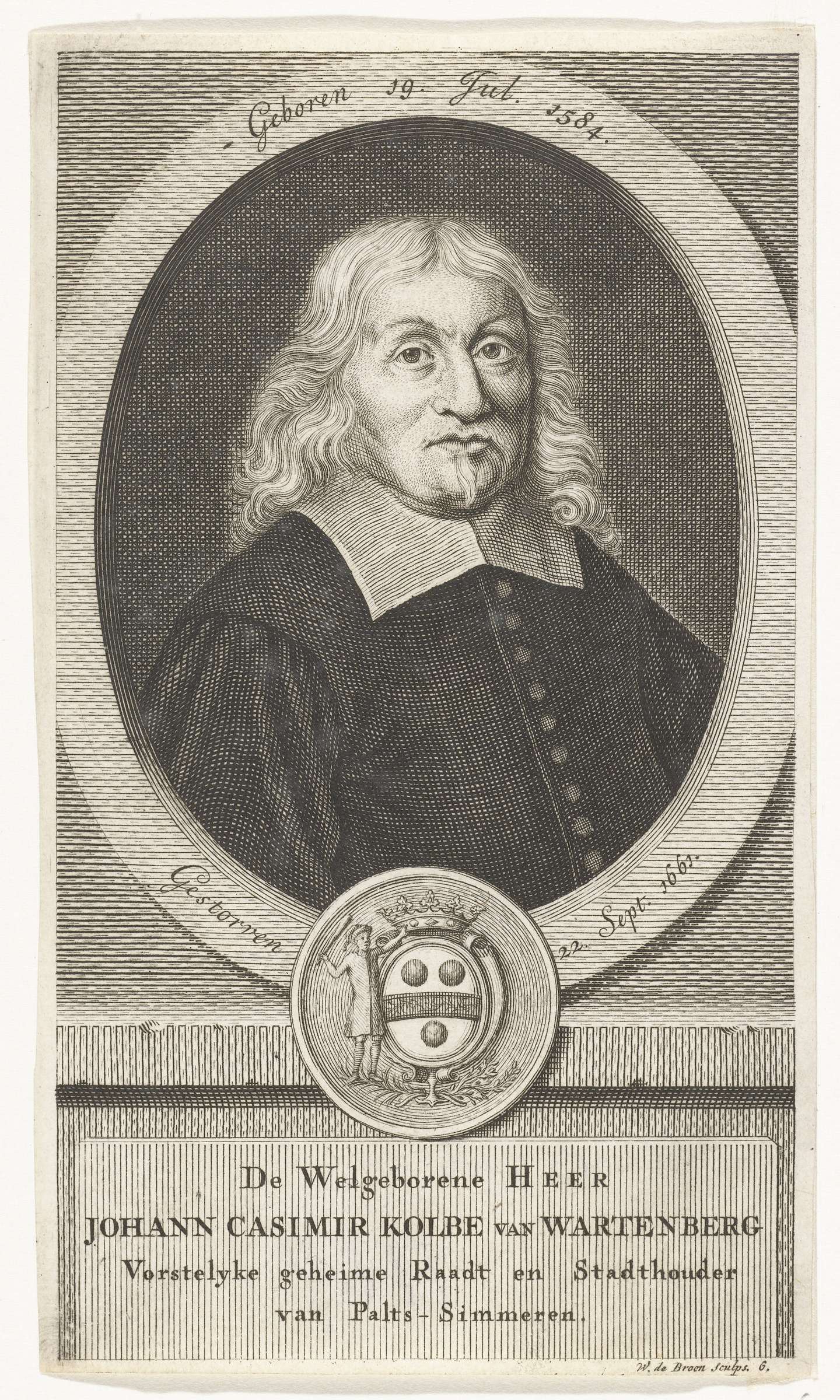Borstbeeld van Johann Casimir Kolbe van Wartenberg, in ovaal met familiewapen. Onder het portret zijn naam en titels.