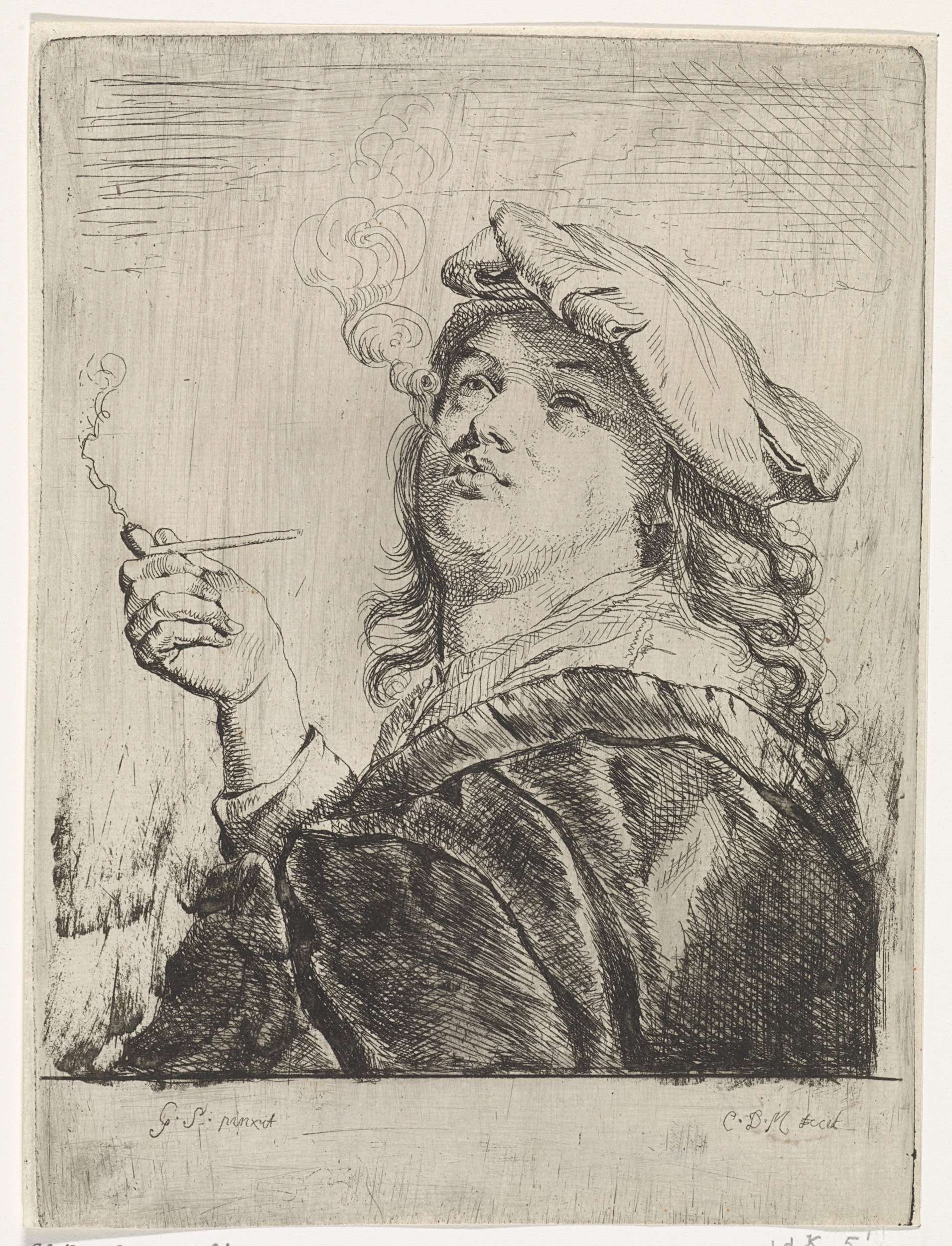 Een man met lange haren en een baret op het hoofd rookt een pijp.