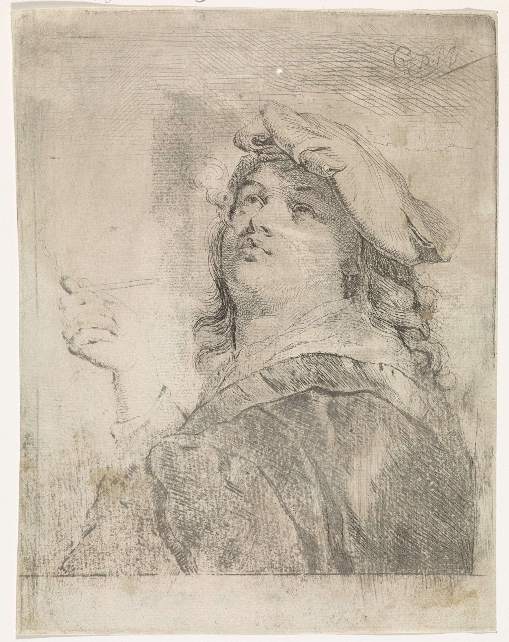 Een man met lange haren en een baret op het hoofd rookt een pijp.