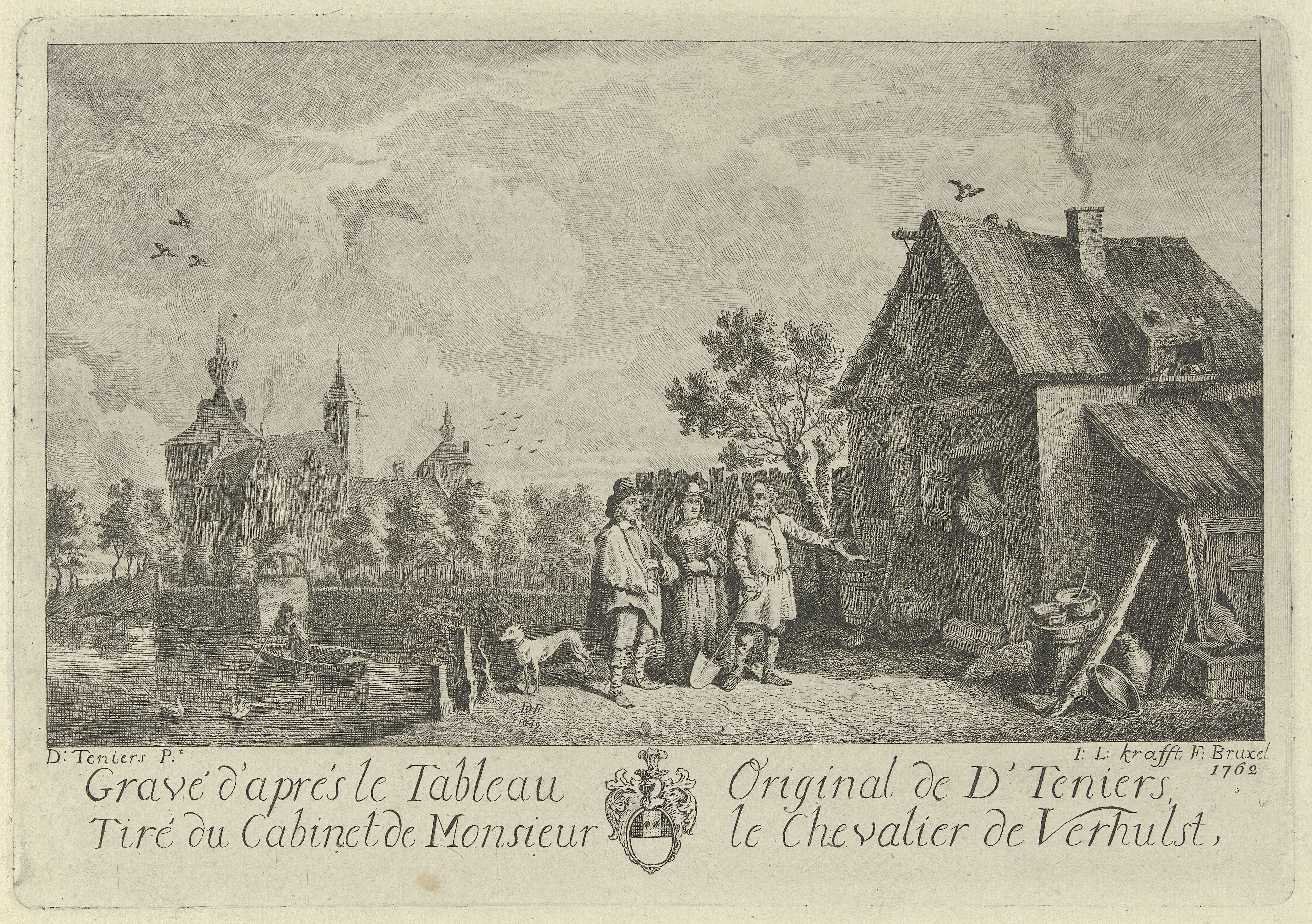 Aan een water ligt een boerenwoning, waarvoor drie lopende figuren. Op de andere oever een kasteel. Onder de afbeelding een tweeregelig onderschrift en een familiewapen.