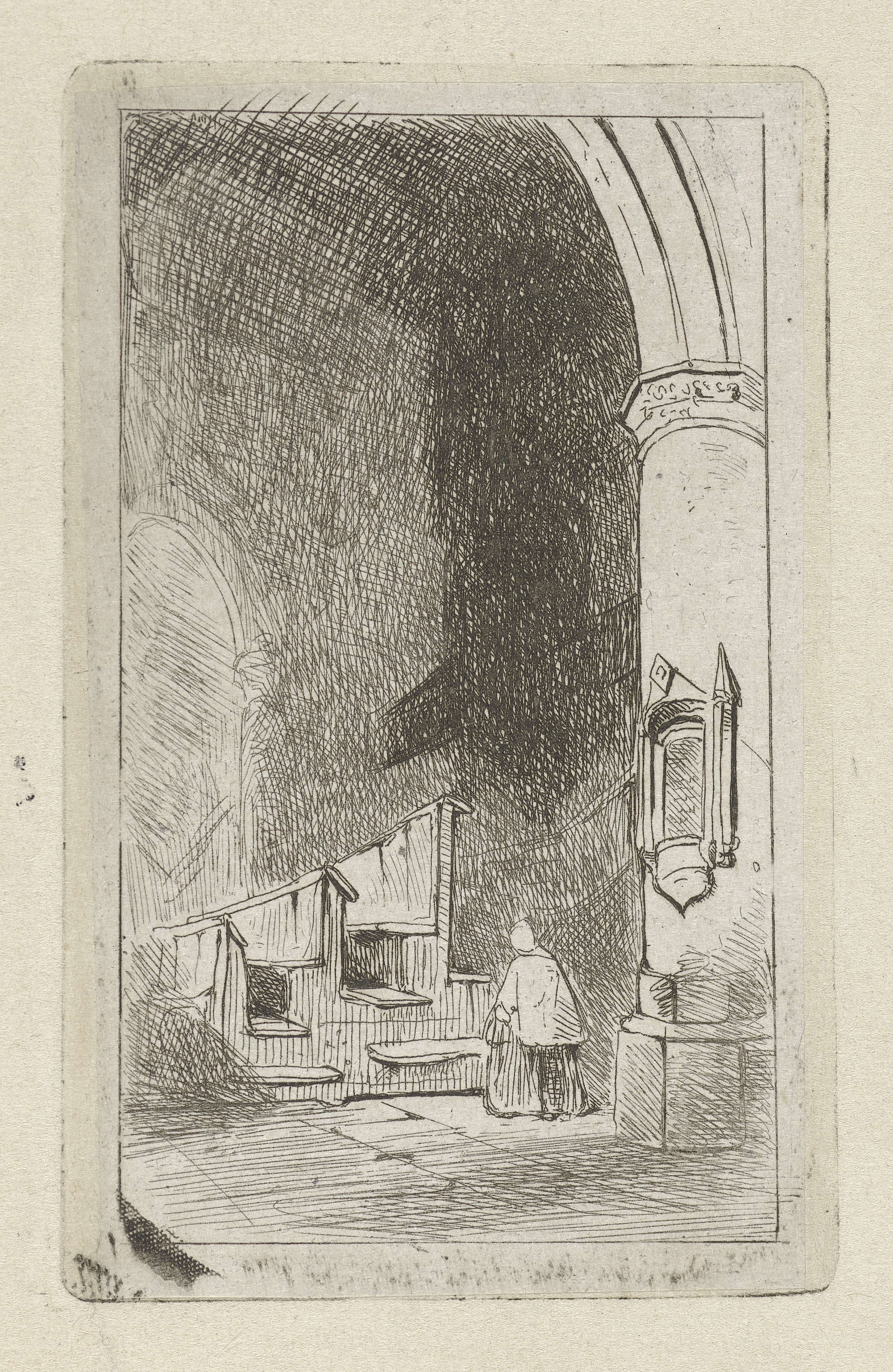 In het interieur van een kerk, met kerkbanken en een orgel, staat een persoon.