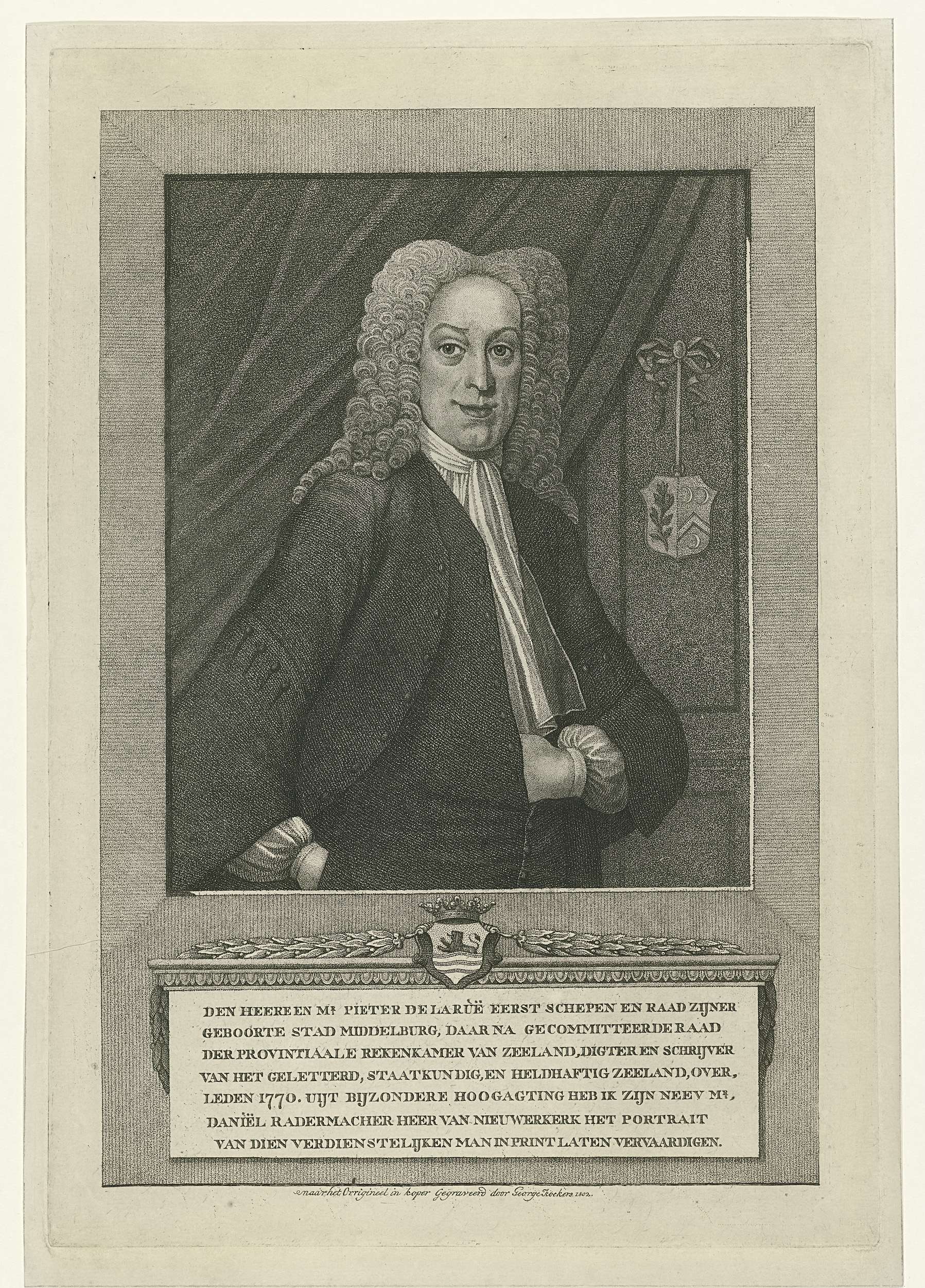 Portret ten halven lijve van Pieter de la Rue, thesaurier en voorzitter van het college van kleine zaken te Middelburg. De la Rue heeft zijn linkerhand in de jas gestoken en draagt een pruik en een sjaal. Aan de muur op de achtergrond hangt een familiewapen. Onder de afbeelding een plaquette met een zevenregelige tekst ...