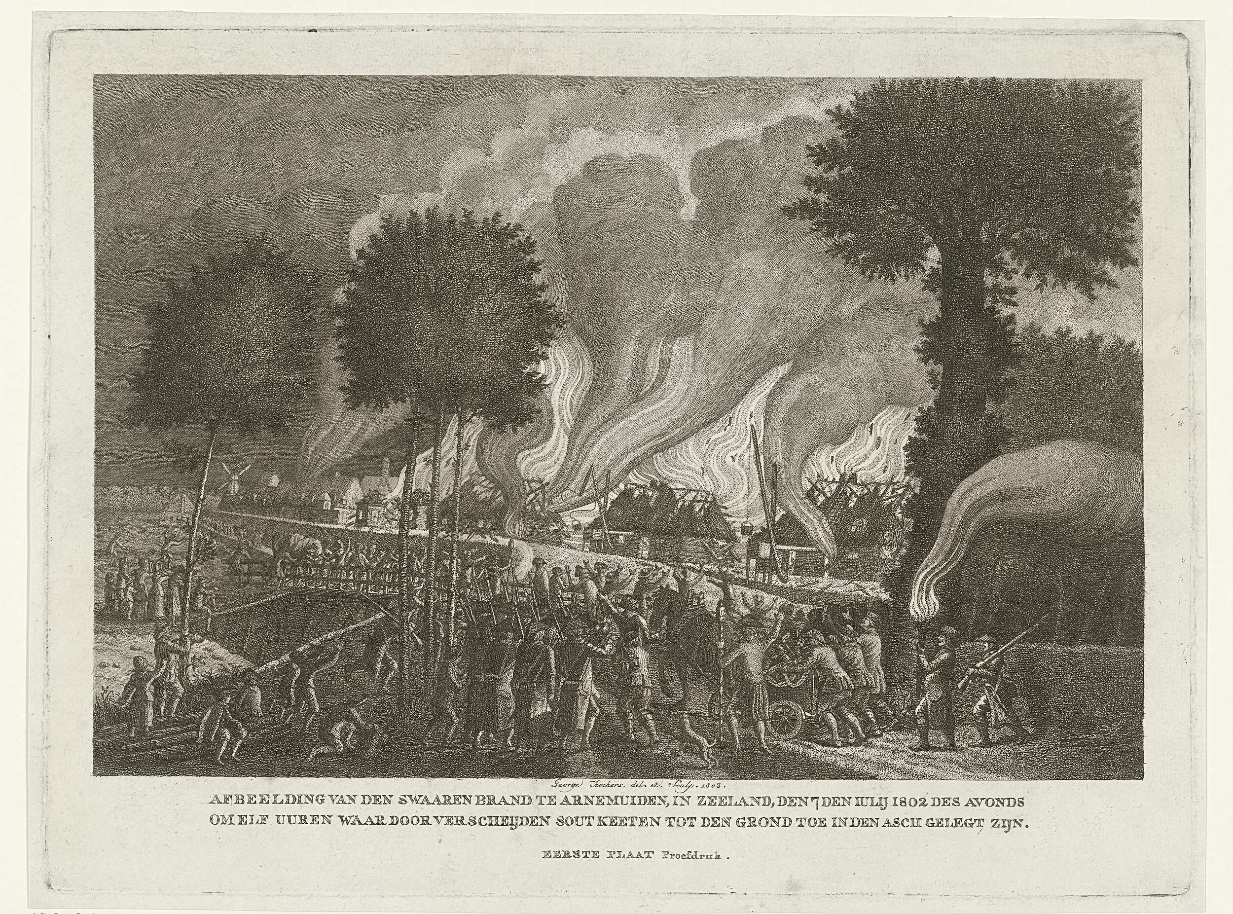 Brand in de zoutketen te Arnemuiden, 7 juli 1802. Afbeelding van het begin van de brand, om 11 uur 's avonds. Op de voorgrond lopen burgers, de brandweer met paard en wagen en de schutterij op de brand toe. Op de achtergrond de brandende keten en de contouren van de stad.