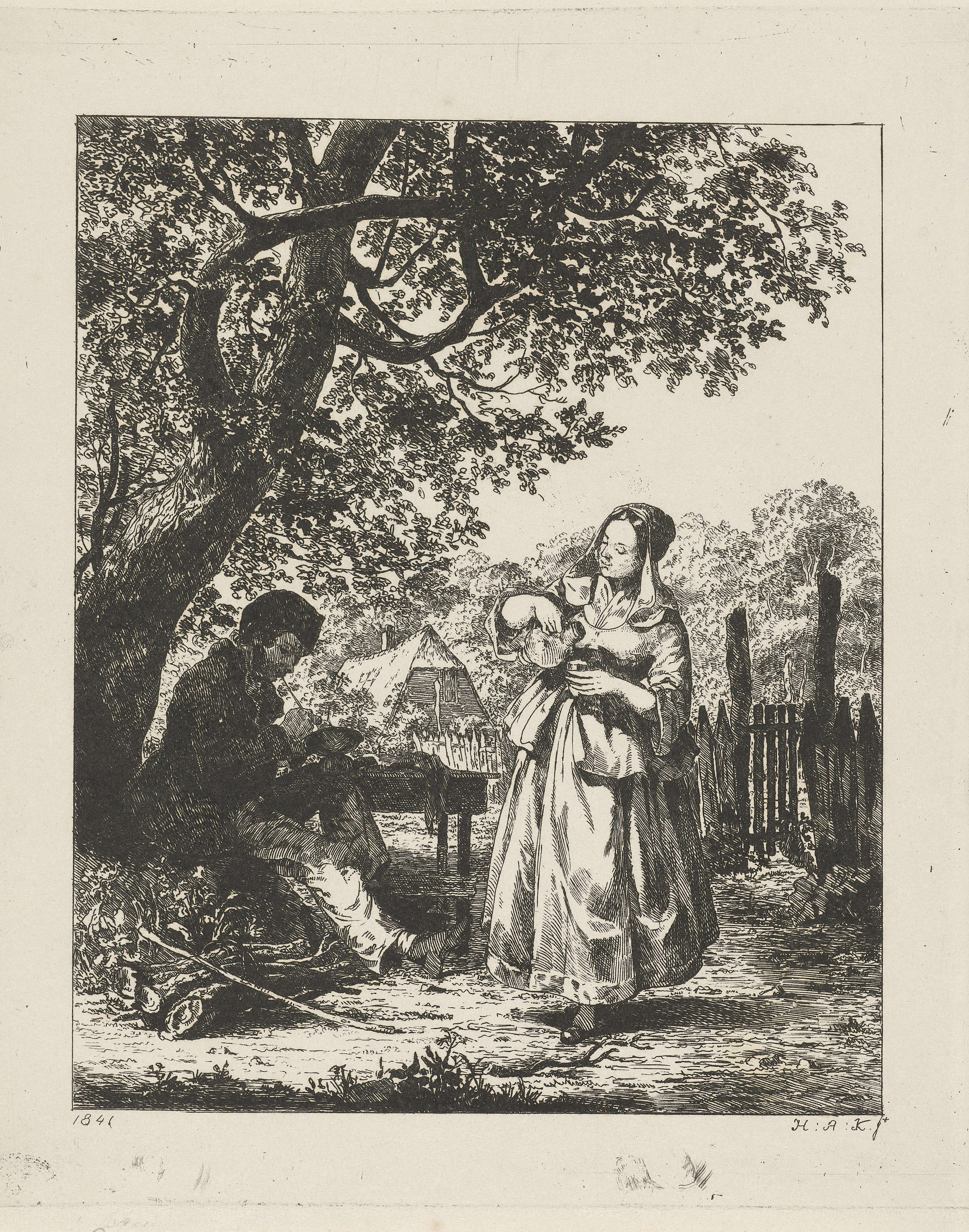 Bij een boerenhoeve in de schaduw van een boom steekt een man zijn pijp aan, terwijl een jonge vrouw zijn beker vol schenkt. De hoeve is omgeven door bomen en om de tuin en het huis staat een omheining van hout.