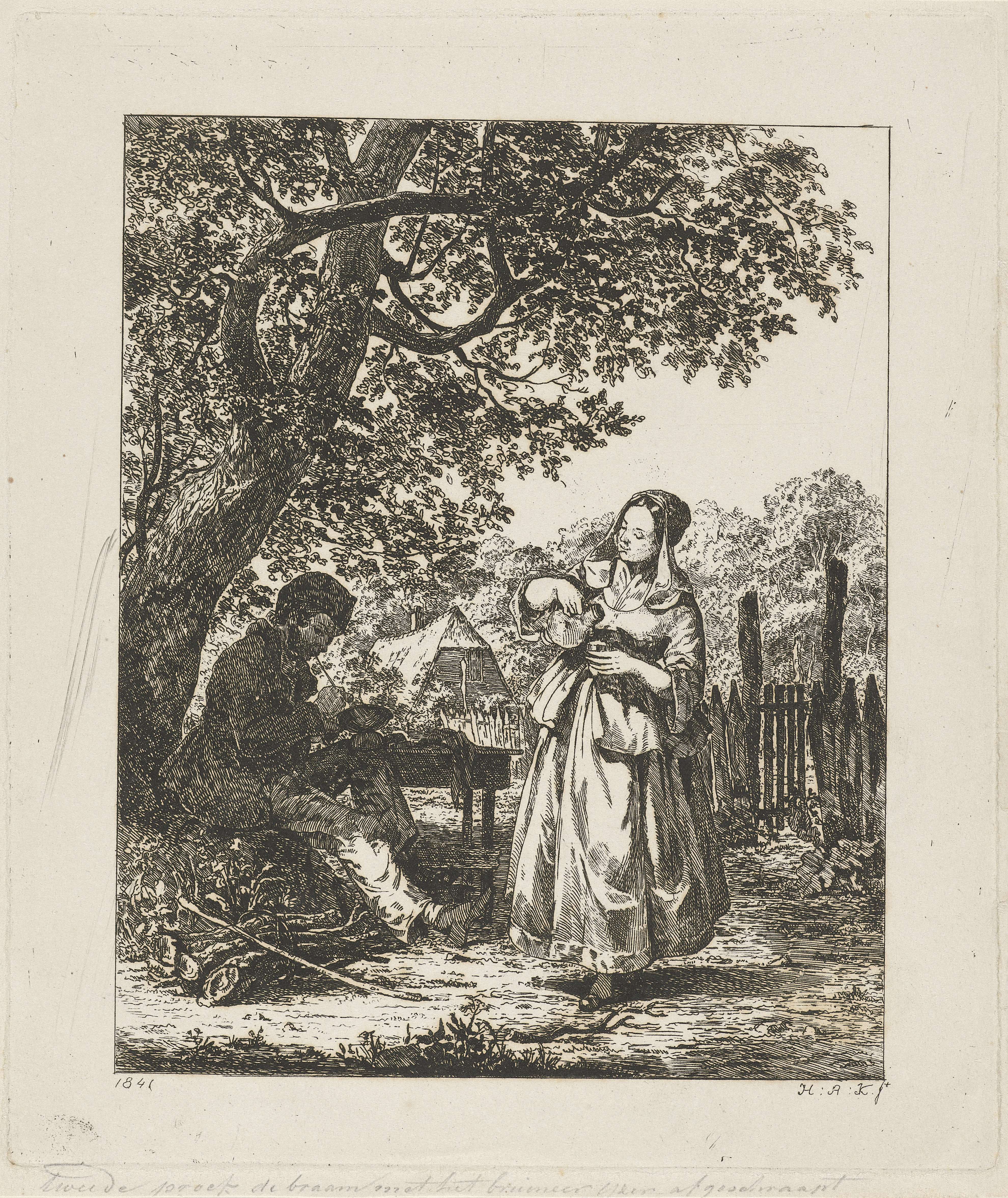 Bij een boerenhoeve in de schaduw van een boom steekt een man zijn pijp aan, terwijl een jonge vrouw zijn beker vol schenkt. De hoeve is omgeven door bomen en om de tuin en het huis staat een omheining van hout.