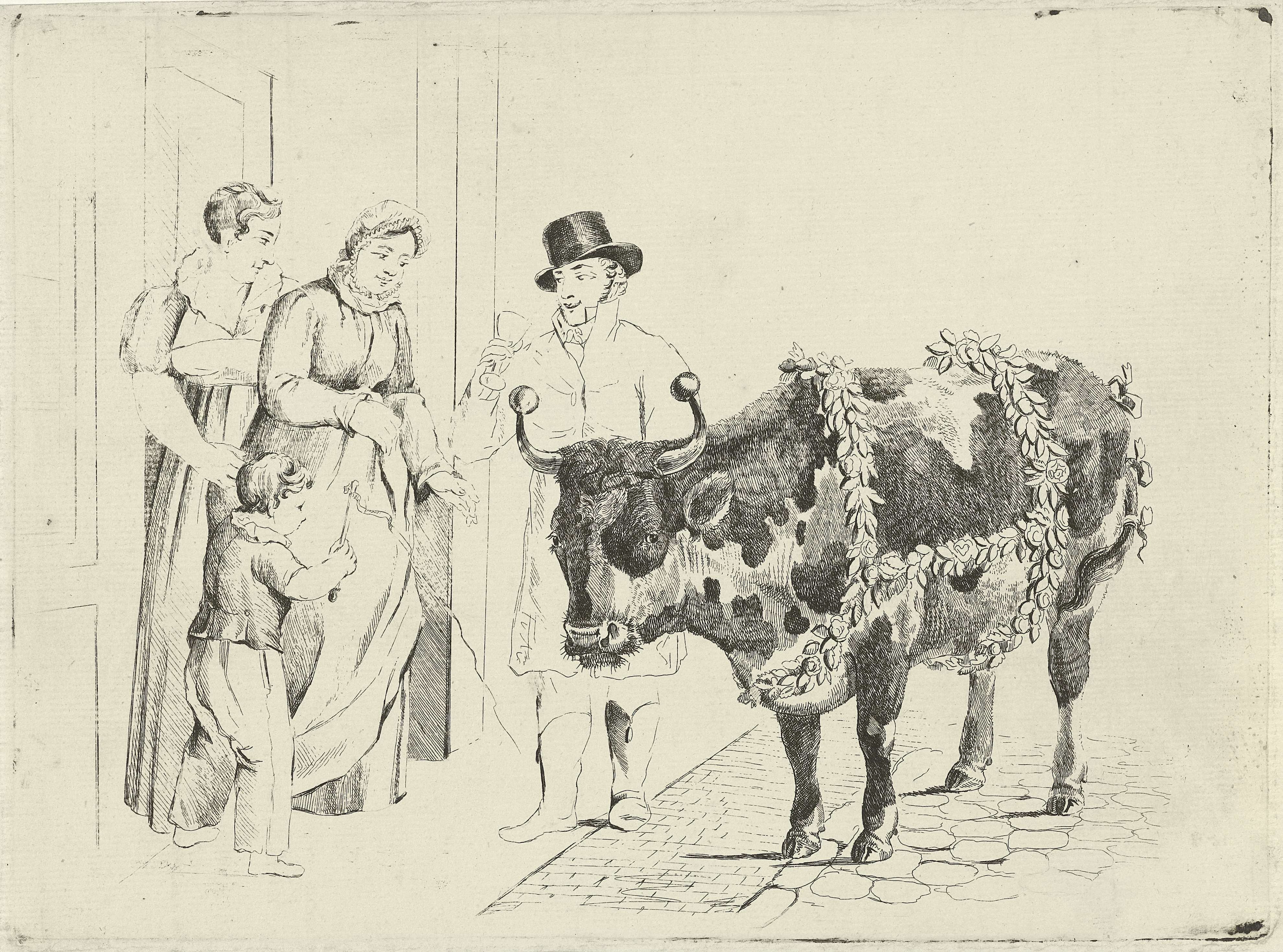 In de deuropening staan twee vrouwen en een kind te kijken naar een man die met een versierde koe op straat staat. De koe heeft ballen op haar horens, strikken om haar staart en een tuig van bloemen om. De man draagt een hoge hoed en heeft een wijnglas in zijn rechterhand.