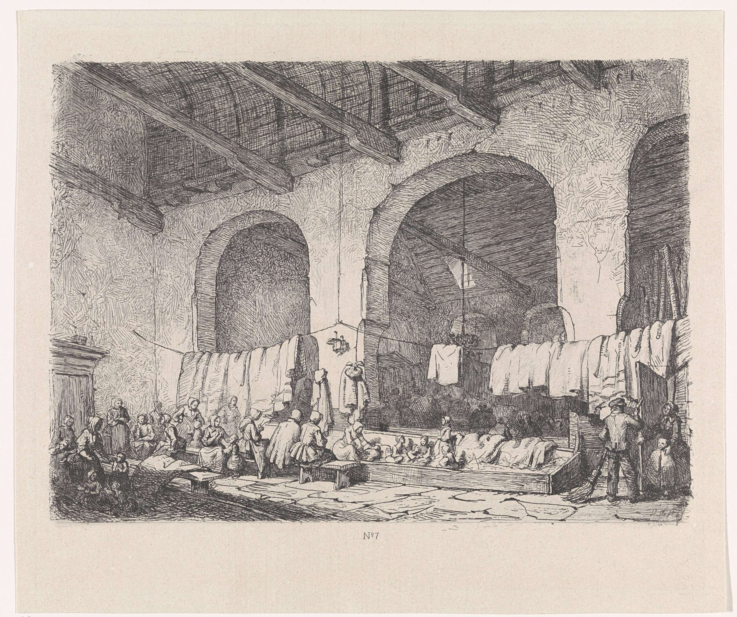 In de Geertekerk te Utrecht bevinden zich slachtoffers van de watersnoodramp van 1855. Op de lange banken zitten voornamelijk vrouwen en kinderen en aan twee waslijnen hangt textiel te drogen. Rechts staat een man met een bezem. Deze prent maakt deel uit van een serie.