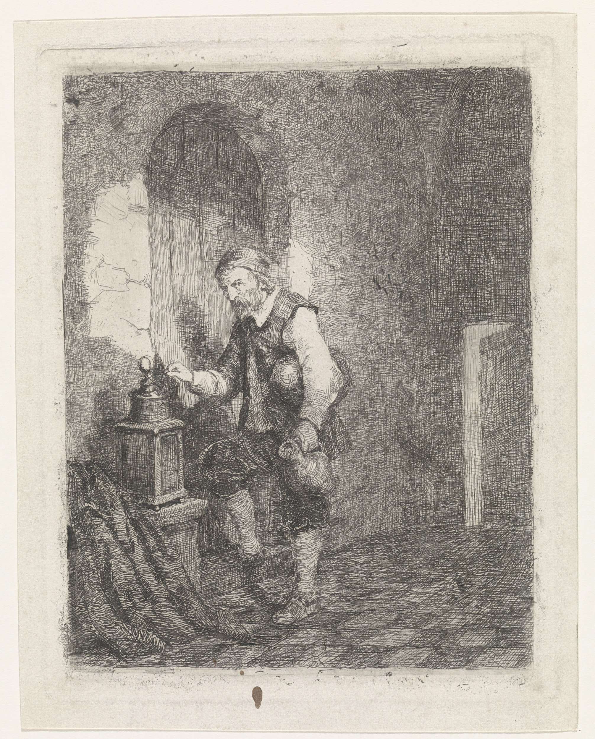 In een vertrek van een gevangenis steekt een cipier een sleutel in het slot van de deur voor hem, terwijl hij zijn blik op de toeschouwer richt. De cipier heeft een kruik in zijn linkerhand en een brood onder zijn arm, naast de deur staat een lantaren.