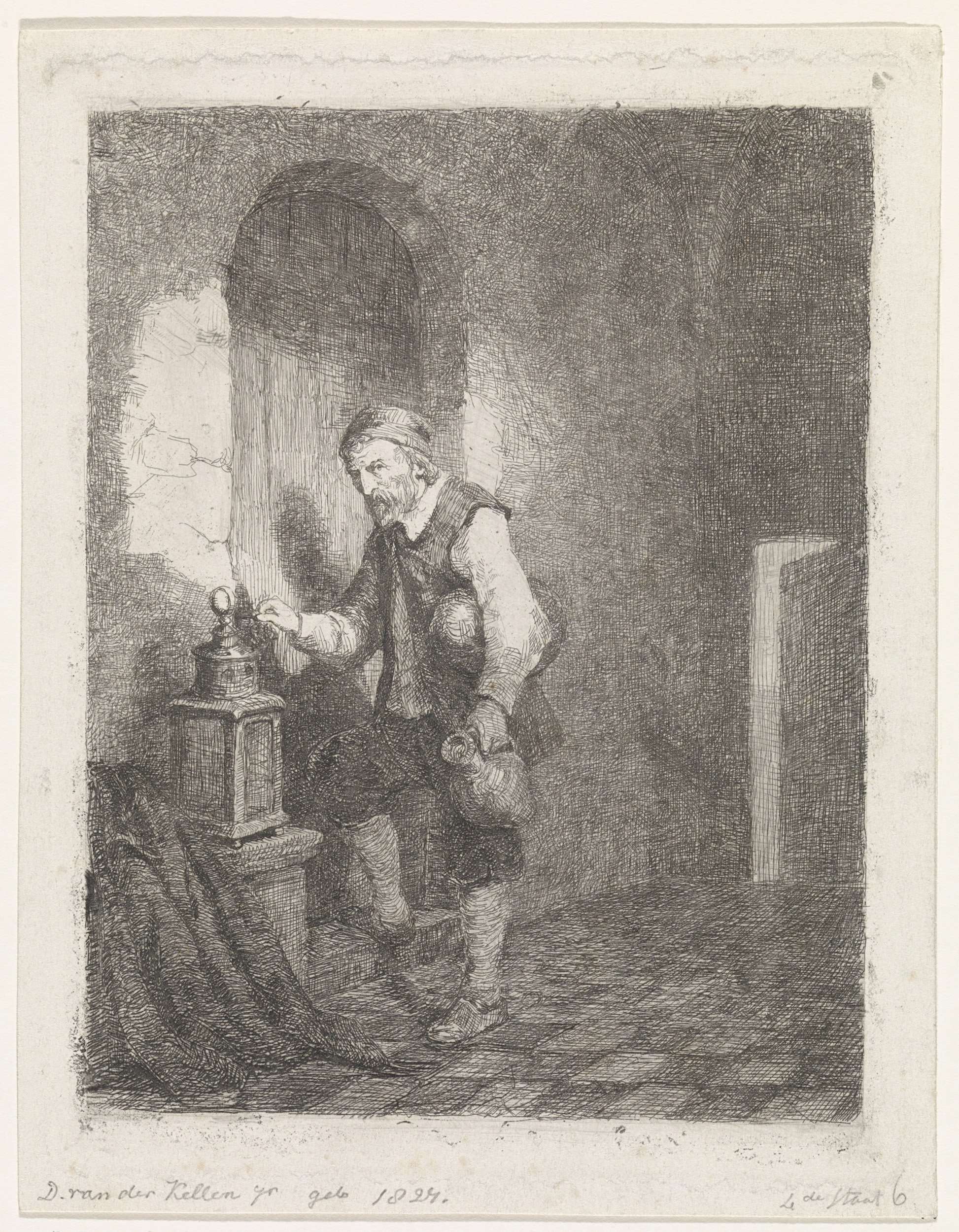 In een vertrek van een gevangenis steekt een cipier een sleutel in het slot van de deur voor hem, terwijl hij zijn blik op de toeschouwer richt. De cipier heeft een kruik in zijn linkerhand en een brood onder zijn arm, naast de deur staat een lantaren.