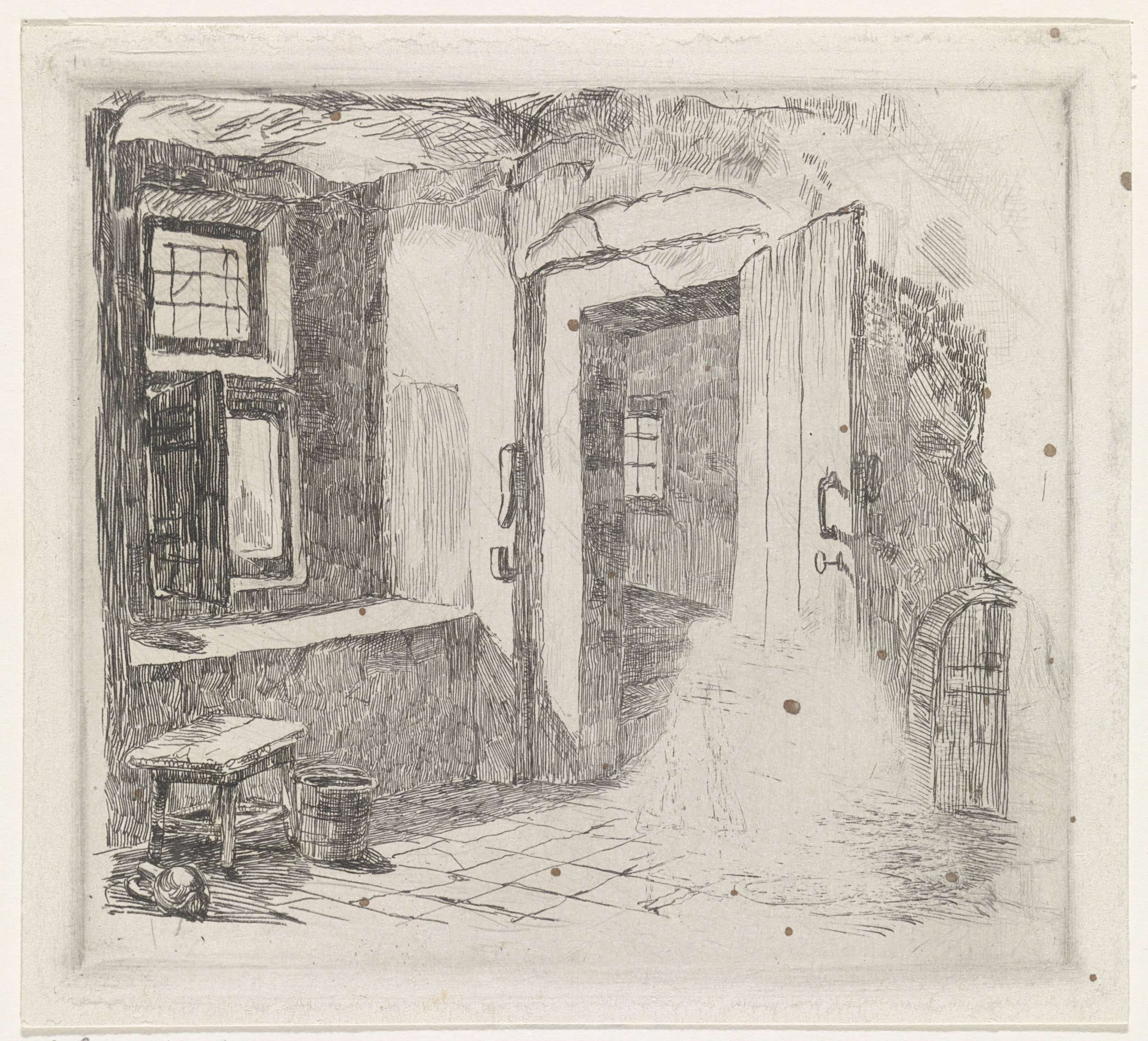 Interieur van een vertrek met openstaande deur, waarin een sleutel steekt. Aan de linkerzijde staan een bankje, een kruik en een emmer.
