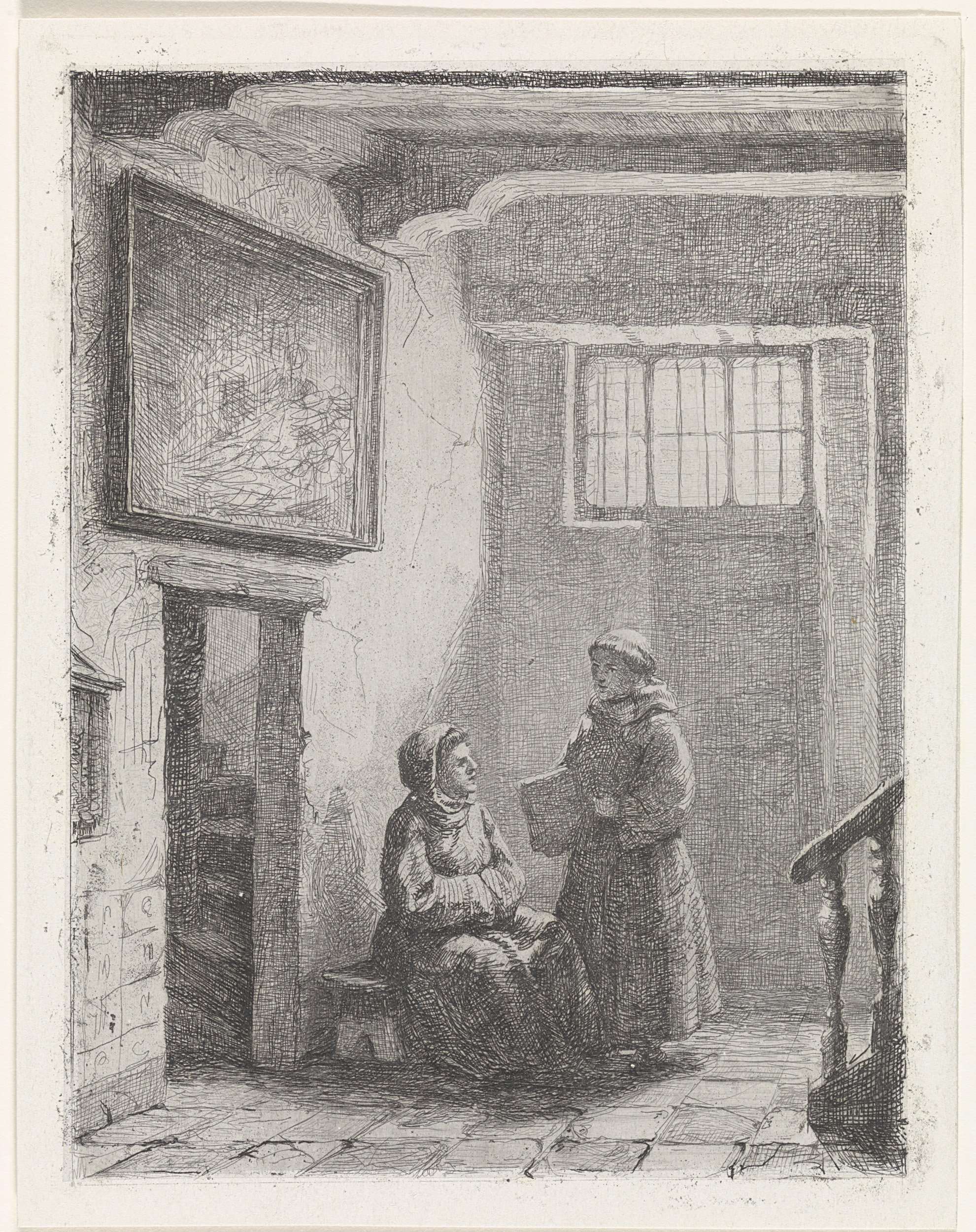 In een hal bevinden zich een zittende monnik en een staande monnik met een boek onder zijn arm. Boven de deur hangt een schilderij en rechts is een deel van een trap zichtbaar.