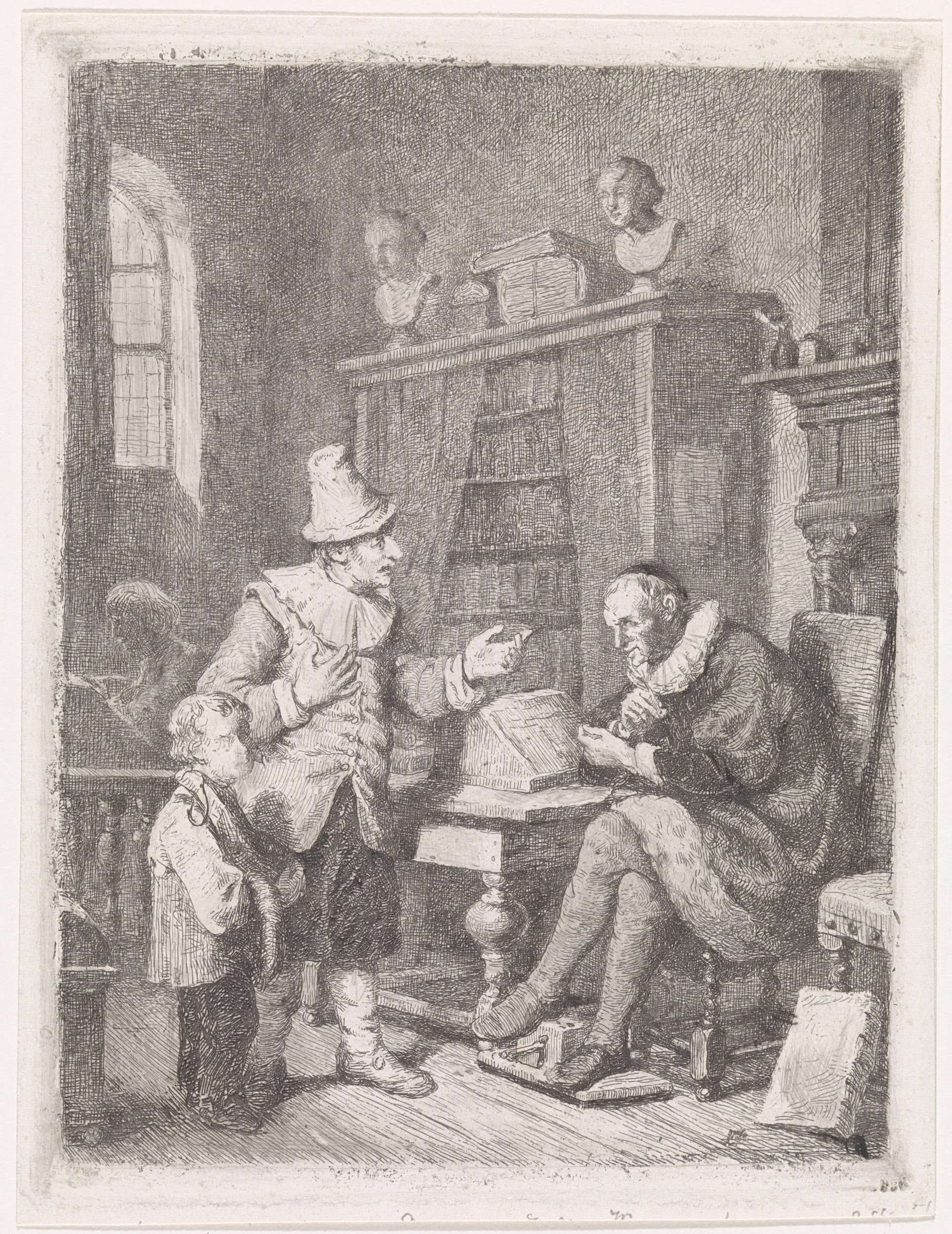 In een vertrek zit een rijkelijk geklede advocaat voor de schouw bij een lessenaar, waarvoor een gebarende man met hoed staat. Bij de man staat een jongetje dat in de richting van de toeschouwer kijkt en een ham en worst bij zich heeft. De man vraagt mogelijk raad aan de advocaat, die de man met ...